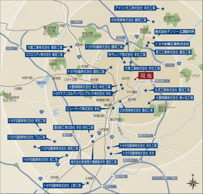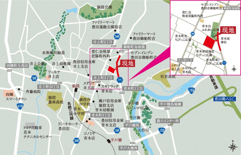 - 名鉄三河線「猿投」駅約950m(徒歩12分)〜約1,095m(徒歩14分)