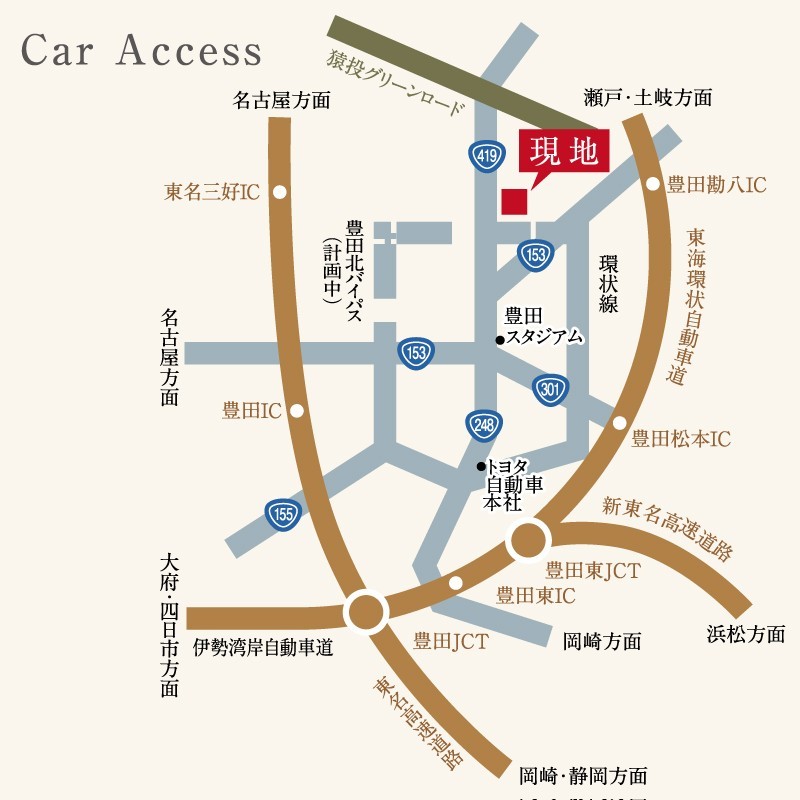 - 東海環状自動車道「豊田勘八I.C.」 / 約2,800m(車5分)