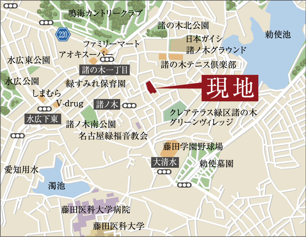 - 名古屋市営バス・名鉄バス「諸ノ木」停(徳重方面) / 約300m~430m(徒歩4分~6分)