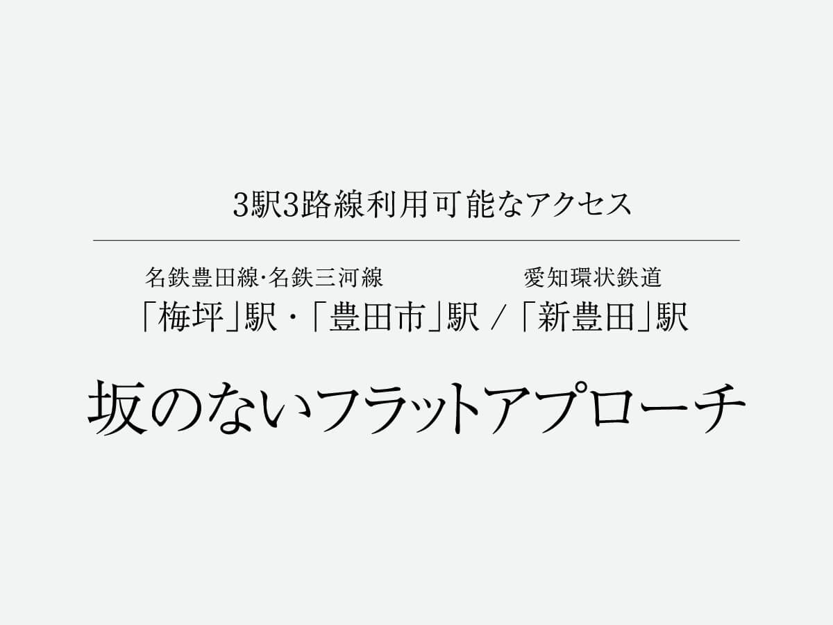 - 名鉄豊田線・三河線「梅坪」駅徒歩13分、名鉄豊田線・三河線「豊田市」駅徒歩15分、愛知環状鉄道「新豊田」駅18分