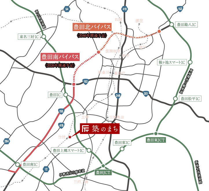 - 豊田ICと豊田勘八ICを結ぶ豊田南バイパスが令和8年度に開通予定。豊田南バイパスは、国道155号のバイパスとして整備中の道路で、豊田市内の移動が格段に容易になり、更に便利になることが期待されます。