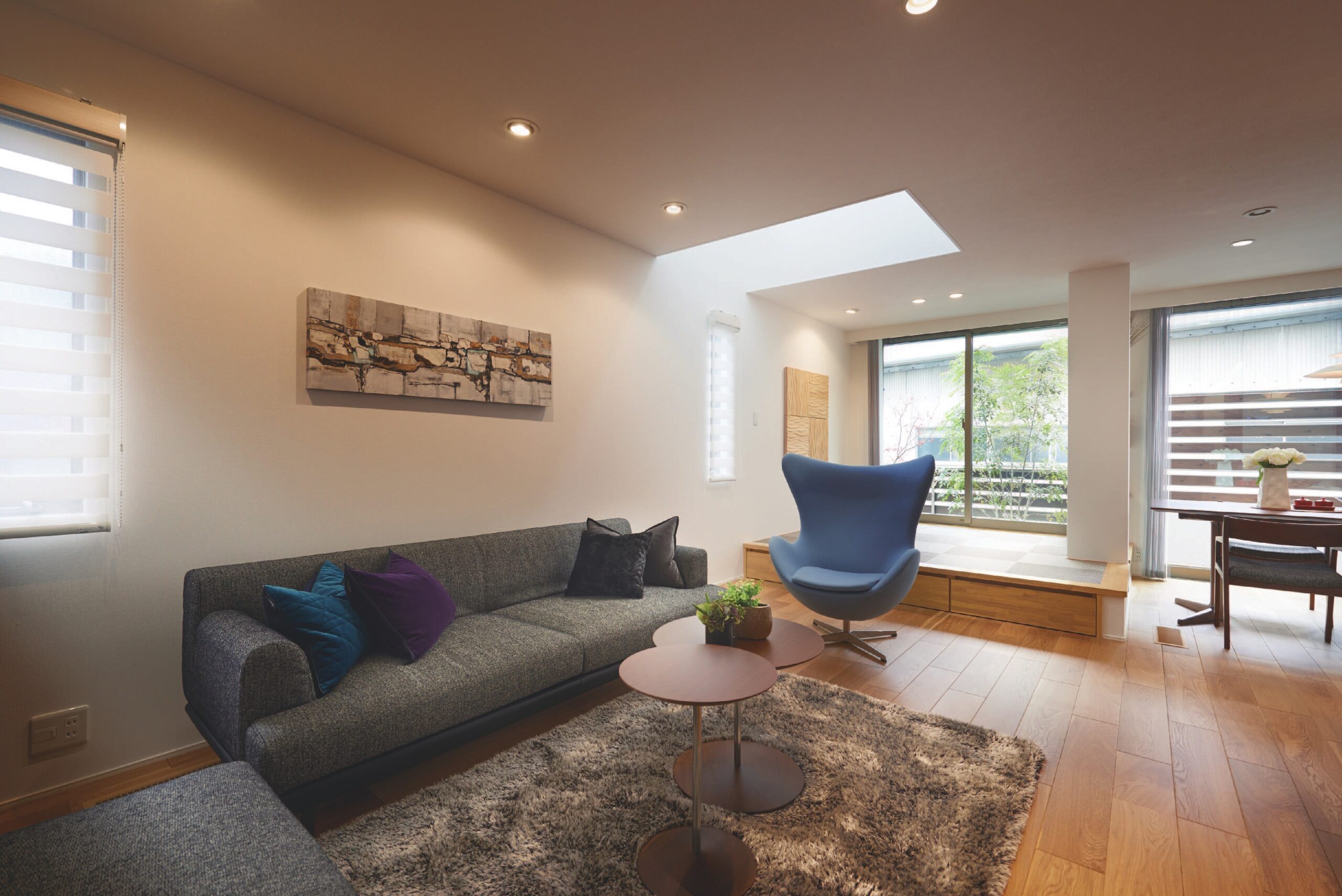 インテリアには間接照明や調光、調色を巧みに組み合わせたライティングで、より深みと上質感を演出しています。木目調の暗めの色を基調とした家具で設え、落ち着きのある空間を演出している。クロスやカーテンに白色を採用することで、フロアをほどよく引き締め、メリハリのきいた印象に。シックな大人の雰囲気漂うモダンな空間になります。