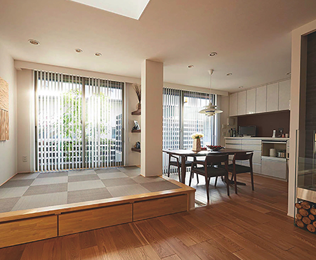 LDKには奥様のご要望で、家事にも使いやすい畳コーナーを取り入れました。また、キッチンはリビングからの視線をそらし、奥様の寝室と隣り合わせにするなど、動線を重視した造りに。先のことを考えて、平屋のようにほとんどの生活が1階で事足りるようにして、2階にはプラスαの空間をレイアウトしました。