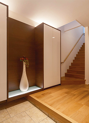 ウォールナットの飾り棚や間接照明が上質感漂う玄関。シューズボックスや土間収納も大容量を確保。緩勾配の階段も魅力です。