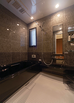 ご主人の希望で浴室は、ブラックカラーにて統一。スタイリッシュな豪華さが漂います。窓を設けて採光性と通気性を確保。
