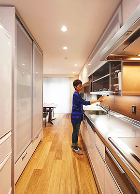 ステンレスキッチンを採用し、シンク上には電動の食器棚を設置。リビングから目隠しの壁面裏には大容量の食器棚を一列に配置。