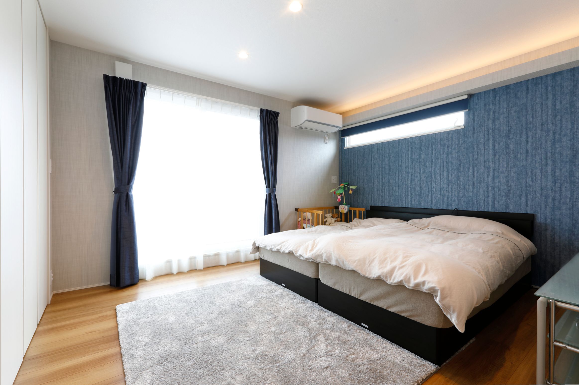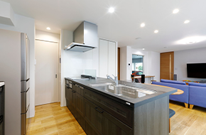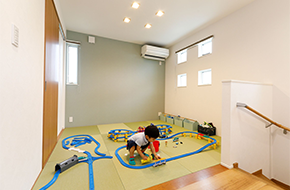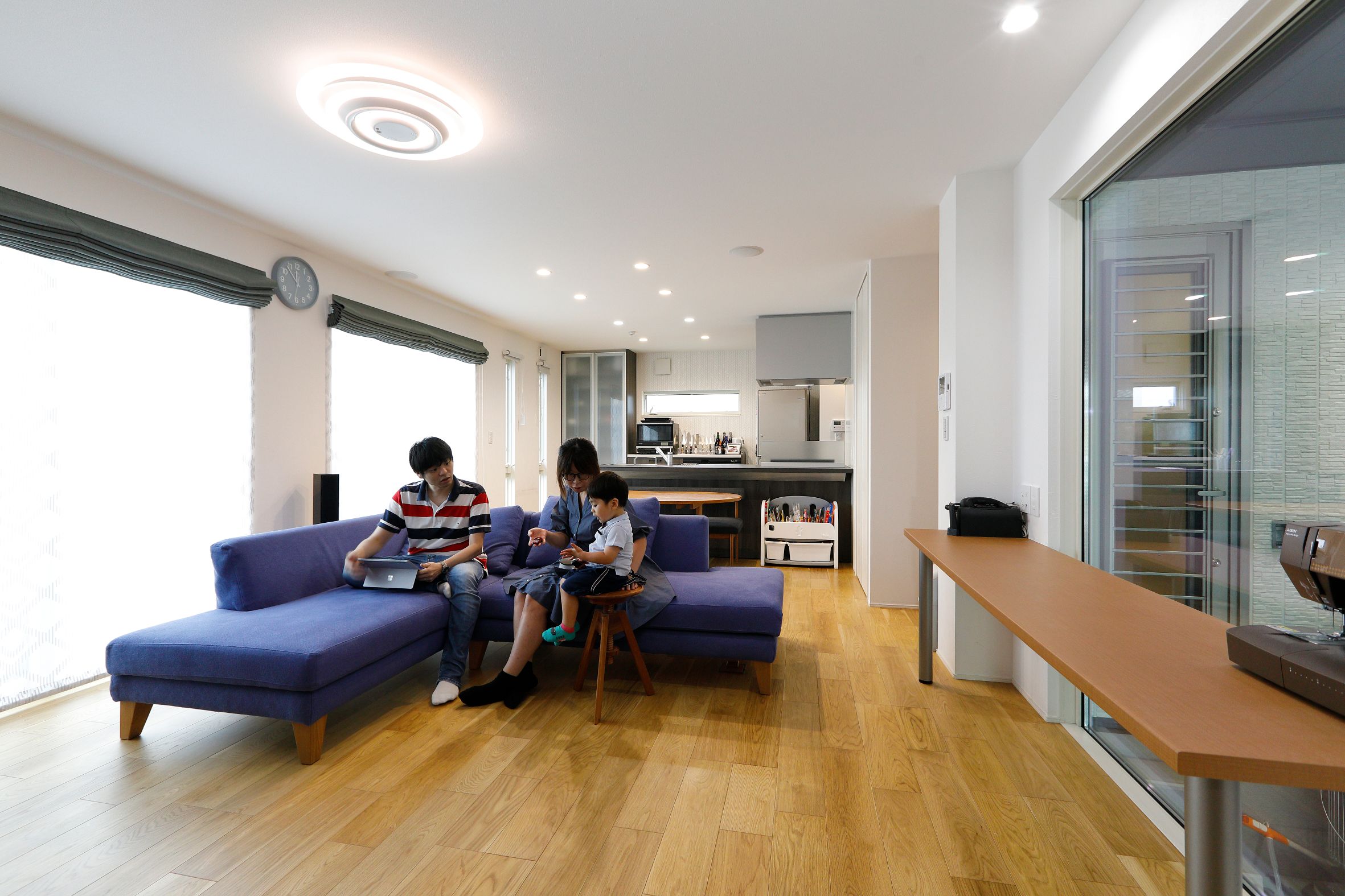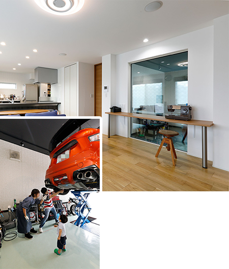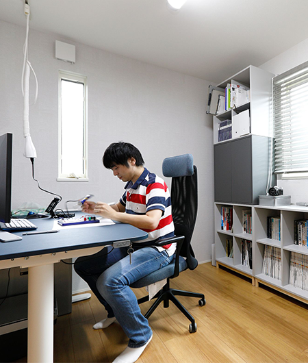 2階建|延床 約45坪|敷地 約53坪 大好きなヒト・モノ・コトと快適に暮らす家 車好きのご主人。映画好きの奥さま。一緒にいるうちに、それぞれの趣味が二人の趣味になりました。車好き憧れのインナーガレージ、臨場感満点のホームシアターシステム、お子さまが走り回れる広い空間、そして趣味から仕事までこなせる書斎まで。どこを切り取っても家族が一緒に現在から未来まで楽しんで暮らせるマイホームです。 1. オーディオにこだわったホームシアターシステム 2. フロアごとにテーマのあるインテリアデザイン 3. 育児も快適なキッチンと脱衣室の動線 家族構成/ご主人、奥様、お子さま1人 竣工年月/2019年3月20日 建物/シンセ・スマートステージ 敷地面積/178.51㎡(53.99坪) 建物面積/1階:88.63㎡ 2階:60.90㎡ 延床面積/149.53㎡(45.23坪) 車好きのご夫婦が趣味を思う存分楽しめるマイホーム。 優しい色調のグレーと、テキスタイル調のアクセントクロスで北欧のイメージで作り上げられた20帖超えのLDKには大きなフィックス窓を設置。ショールームのように愛車を眺めることができるという車好きにはたまらないシチュエーションです。フィックス窓に沿って造作したデスクは、奥さまがおうち時間を有意義に過ごすために始められた裁縫や家事をする際に活用されているほか、将来的にはお子さまのスタディスペースにもなる予定です。 映画の世界を意識したインテリアの工夫 ご主人の書斎はブラインドやクロス選びなどによって、スパイ映画に登場するラボのような空間です。アイデアを書き留めるためのホワイトボードや、姿勢を変えられるので長時間向かっても疲れにくい昇降式のデスクなどを装備。趣味の延長線上にあるという仕事を、在宅でも快適にこなせるよう実用面の設備を充実させた、ご主人にとって不可欠な空間です。 キッチンのワークトップはセラミック製。パンを作る際のこねる作業も直接できて使い勝手も良好です オープンスタイルの2階の畳スペース。畳の目の方向を変えることでスタイリッシュな印象に仕上げています コーブ照明で癒しの空間を演出する寝室。蓄光仕様のクロスを採用し、消灯後やブラックライトを当てると寝室の天井に星空が現れます キーワード モダン外観 家事ラク動線 車と楽しむ 面積 45坪以上