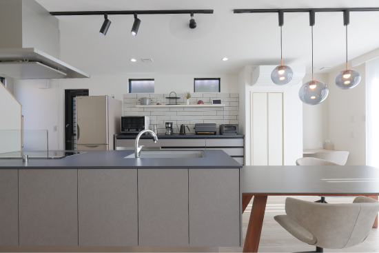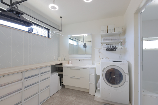 お子さまがのびのびと遊べるようLDKをできるだけ広く取りました。壁掛けテレビ、ダウンライトなどを採用することで実際の面積以上に広く感じられます。スペースを必要とするアイランドキッチンを設置してもゆとりのあるLDKになりました。子育て真っ只中のI様にとって“家事ラク”も大きなテーマのひとつ。洗濯の全ては洗面室で完結させ、脱ぐ、洗う、干す、畳む、しまうの動線をシンプルにすることで家事効率がアップしました。また、たくさん買物した時は勝手口の近くに車を停めてキッチンまで荷物を楽に運べます。荷物を抱えての移動距離が短く、食料品やストック品を冷蔵庫やパントリーにすぐに収納できます。