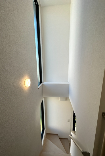 階段の吹抜けを利用した採光窓。白を基調とした空間に光が回り、北側でも十分な明るさが得られます。