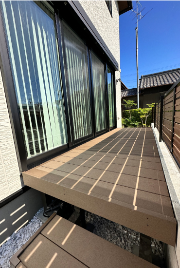 リビングダイニング前にウッドデッキを設置。夏は、小さなプールを置いて水遊びを楽しみました。
