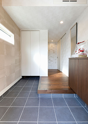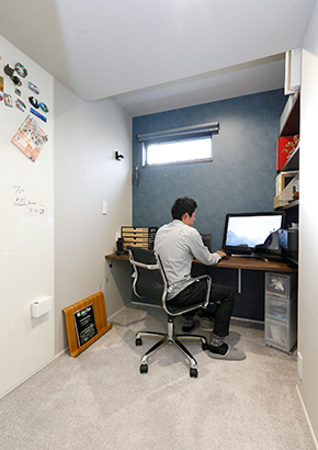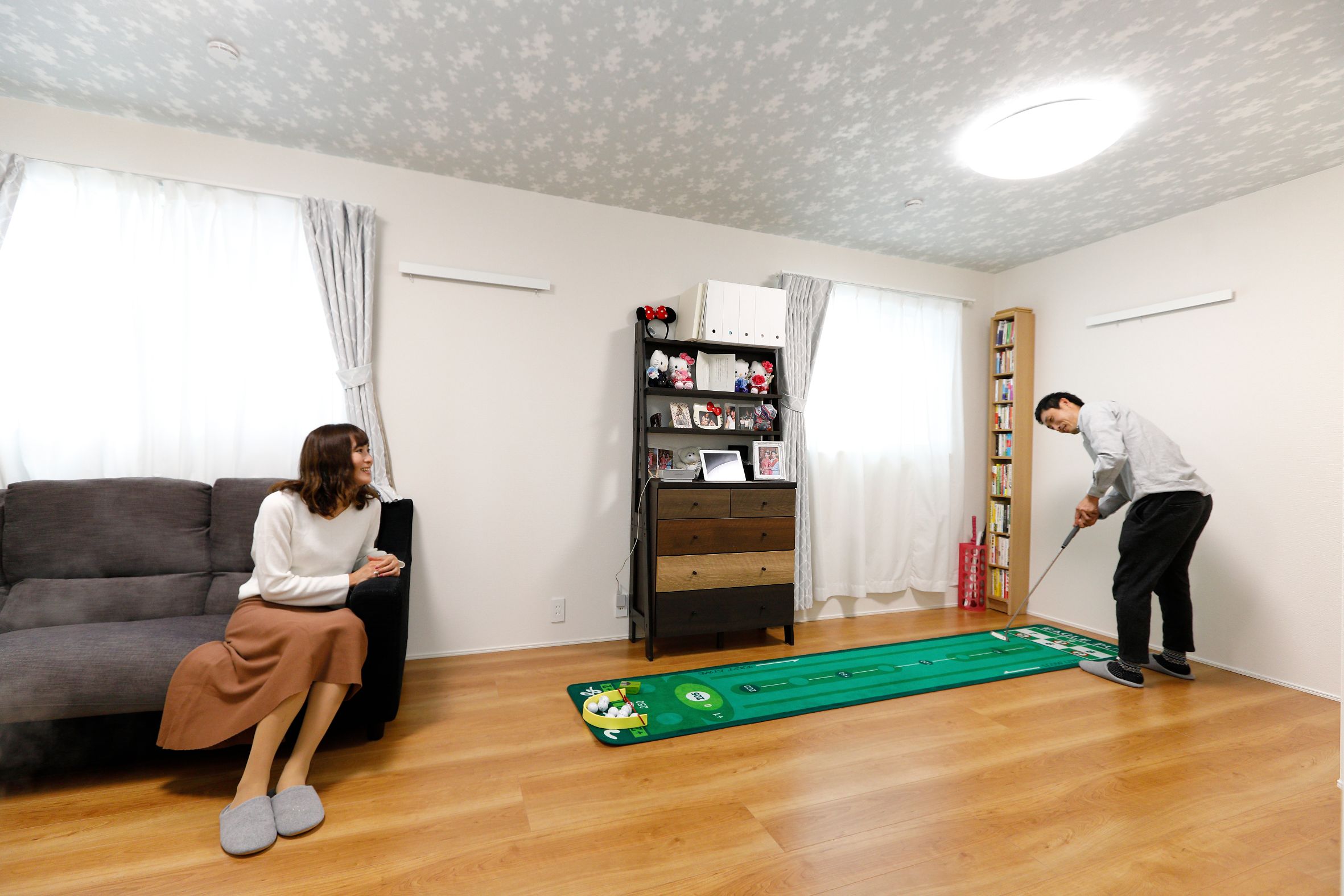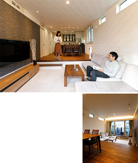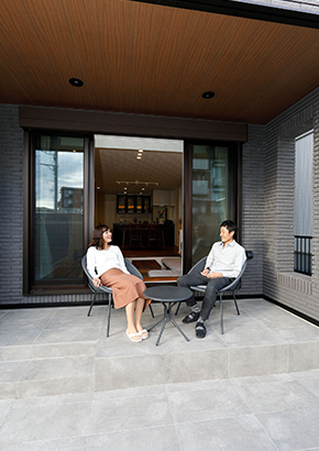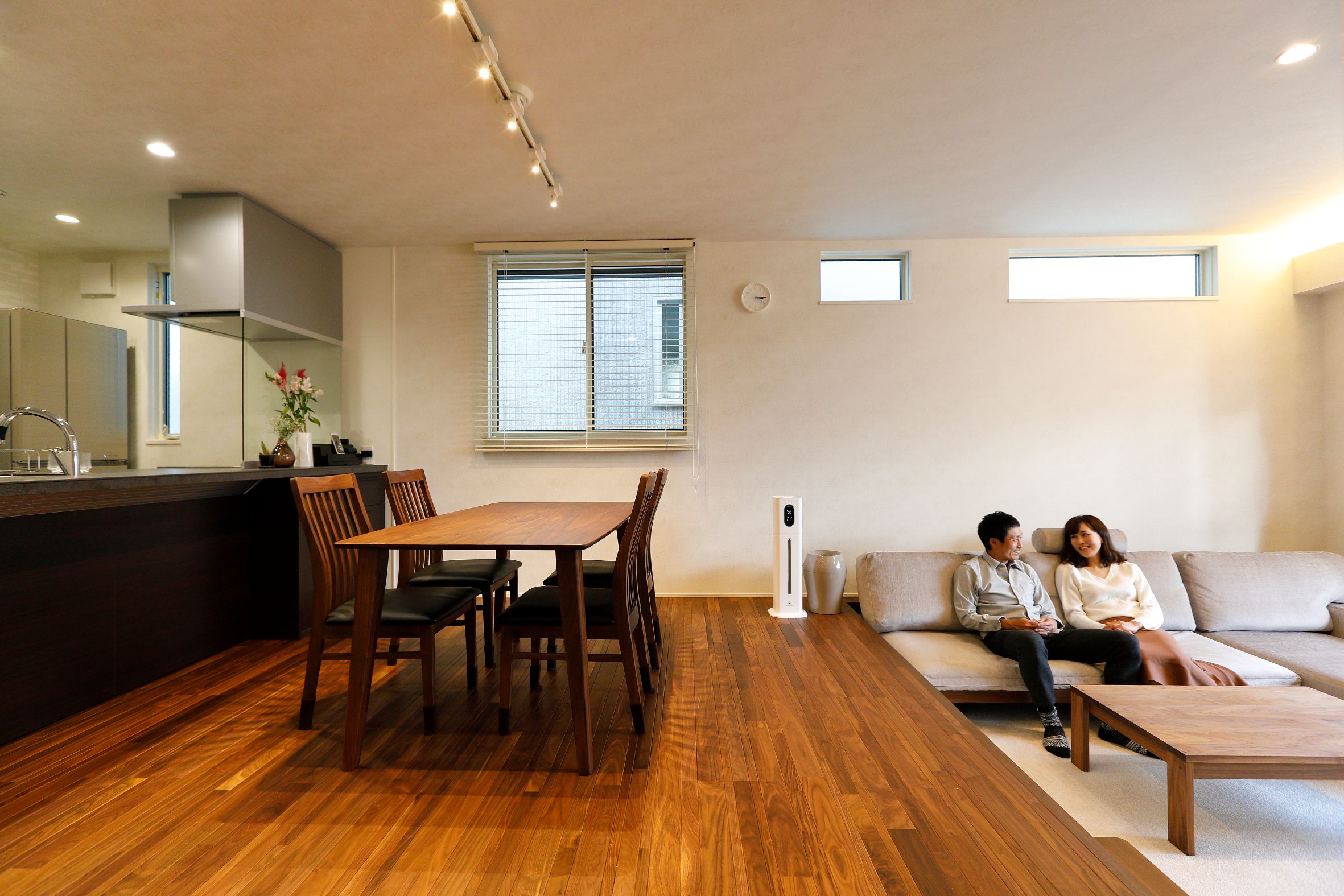 2階建|延床 約37坪|敷地 約49坪 開放感と空間の差別化を叶えた巧みな空間デザイン こだわりはないと思っていたのにマイホームづくりをスタートしたらあふれるようにイメージが湧いてきて、「ずいぶん無理な要望も出したと思います」とA様。その一つひとつに、想像を超えた提案で応える、トヨタホーム&LIFEのスタッフとの共同作業が楽しくて仕方なかったそう。スマート・エアーズの設置方法や天井、壁のアレンジなど、そこかしこに変化球を散りばめたダイナミックな空間演出。ご夫妻が出会ったタイや旅したアジアンリゾートを彷彿とさせる癒しのマイホームが完成しました。 1. 開放感と空間の差別化を叶えるダウンフロアリビング 2. 直線で魅せるモダンな外観 3. 洗濯動線に無駄のない2階に配置した浴室&ランドリー 家族構成/ご主人、奥様 竣工年月/2020年7月11日 建物/シンセ スマートステージ 敷地面積/164.00㎡(49.61坪) 建物面積/1階:64.19㎡ 2階:59.35㎡ 延床面積/123.54㎡(37.37坪) 寛ぎ憩う癒しの空間、ダウンフロアリビング ダイニングとリビングの間に段差を設けた、ダウンフロアリビングを採用されたA様邸。40㎝の床の高低差がLDKのひと間を緩やかに仕切り、囲まれた形状が「籠った感じで落ち着く」という快適性を高めています。さらに段差の分だけ縦の空間が広がり、ダイニングキッチン側からとリビング側からの視線の高さが変わることで躍動感が生まれるのもダウンフロアリビングの魅力です。 スタイリッシュなデザインと安全性にも配慮をしたインテリア ダイニングキッチンは天然木のフローリング、リビングはカーペットと、床材を変えることでリビングでは床に直接座ることができるだけでなく、ステップのある場所を明確にして安全性にも配慮しています。ダイニングやアウトドアリビングへの行き来に使う階段でもあるステップは安定して足が乗せられ、ベンチ代わりに腰かけられることもできるよう奥行きや長さ、素材にもこだわりました。 プライベート感あふれるアウトドアリビングは、軒が深く雨や日射をしのぎながら家庭菜園やBBQを楽しめます。 1階にある書斎も、天井の高低差によって空間に広がりが感じられます。 天井の高低差と奥行きの長短が、遊び心のある空間を作り出している玄関ホール キーワード スマートハウス モダン外観 自然や庭を楽しむ 面積 35〜40坪まで