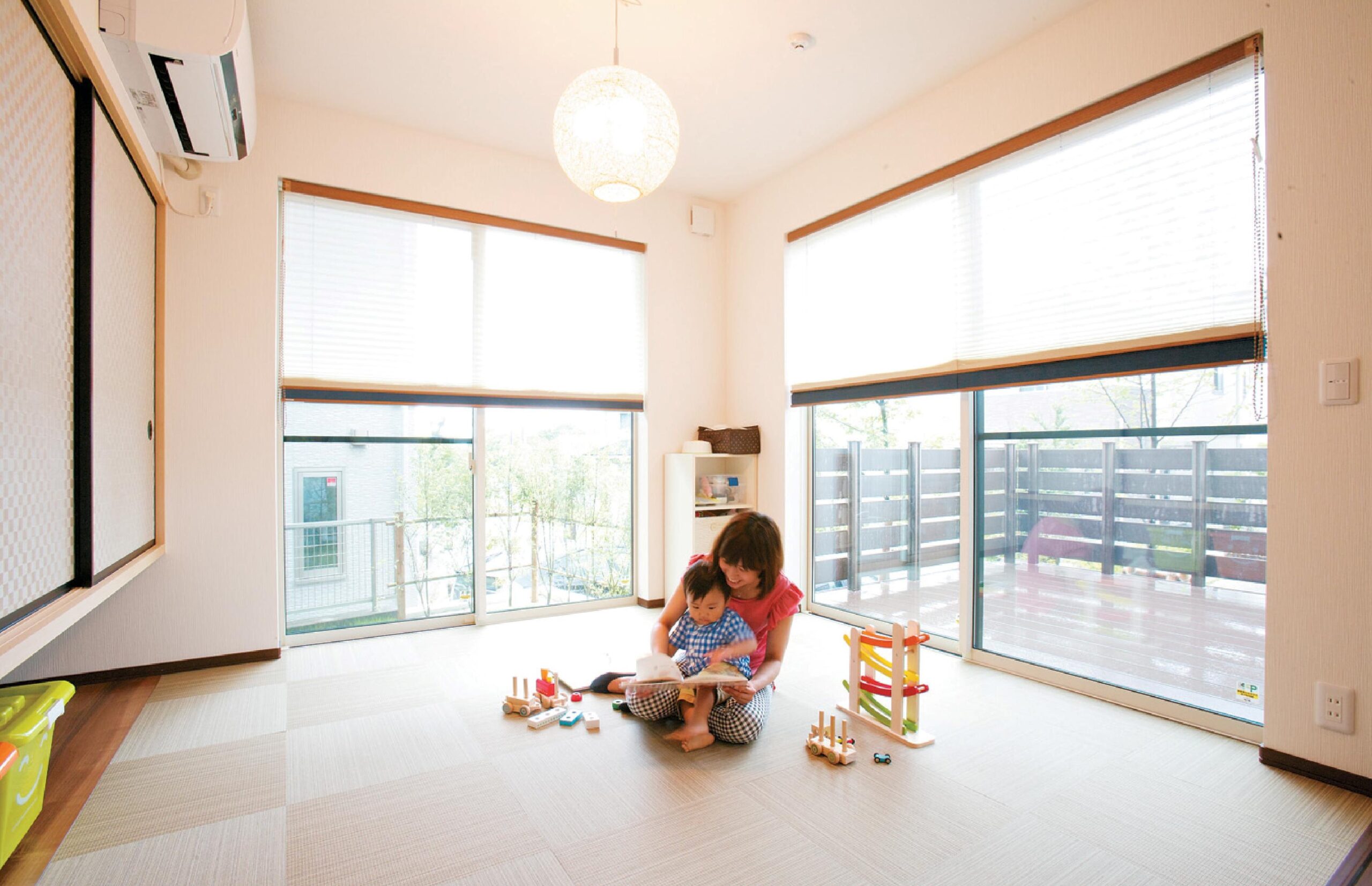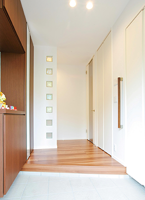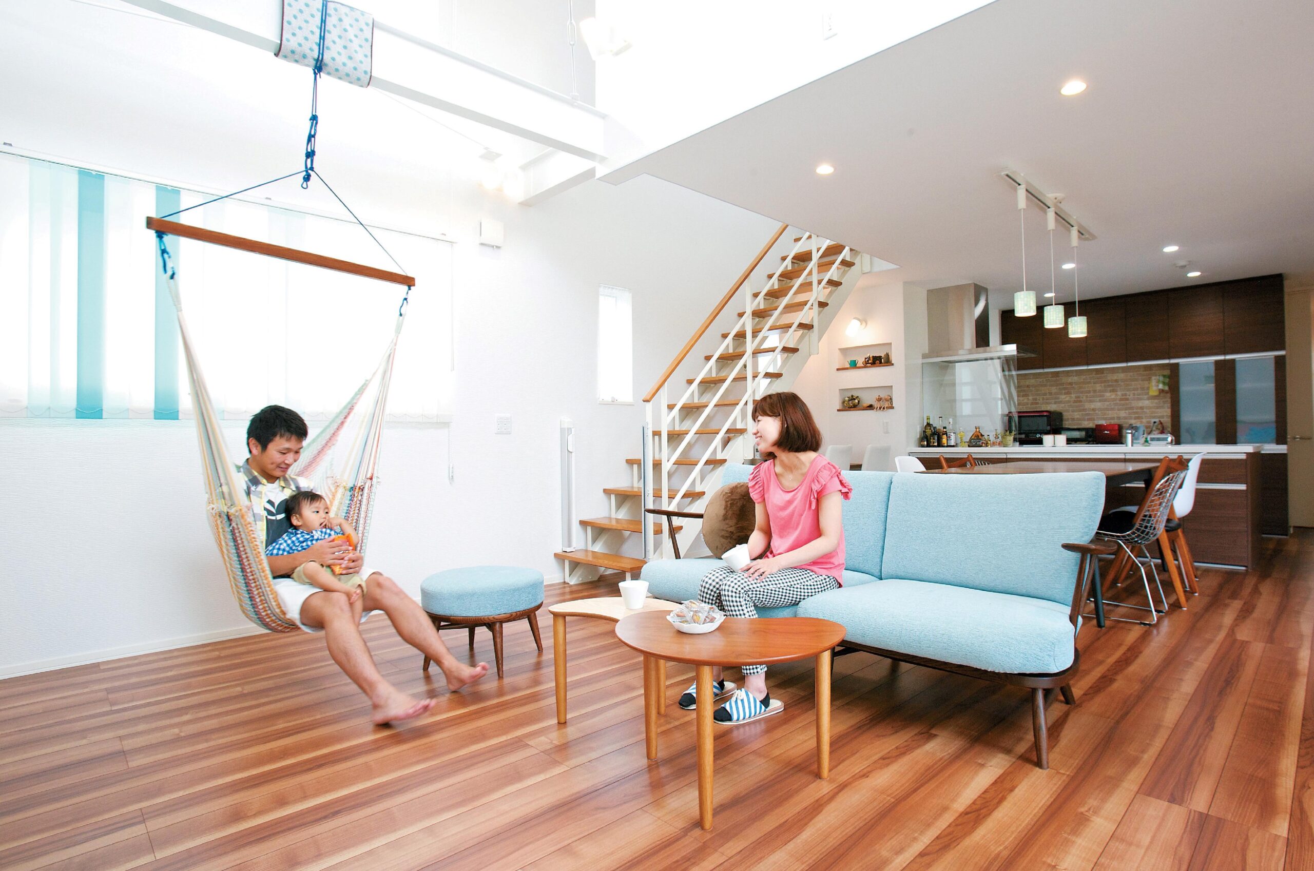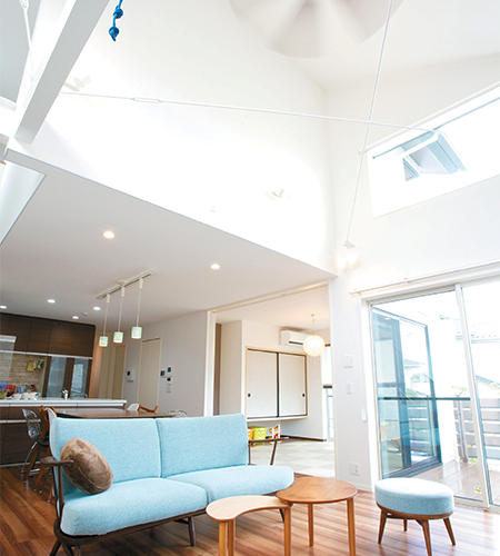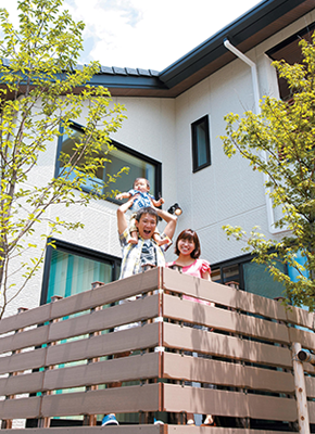 2階建|延床 約39坪|敷地 約64坪 「仲の良い家族が住んでいそうな家」を建てたい たくさんの人が集まる家にしたいというコンセプトのもと、まずはご夫婦で住みたい家のイメージづくりからスタートしました。スケルトン階段や吹き抜けを取り入れ、家族や友人が集まっても、圧迫感を感じない開放的で広々としたマイホームを実現しました。 1. 吹抜けとスケルトン階段 2. ブルーを取り入れたスタイリッシュなデザイン 3. 街のシンボルツリーが眺められるレイアウト 家族構成/ご主人、奥様、お子さま 竣工年月/2015年2月3日 建物/エスパシオEF 敷地面積/212.88㎡(64.39坪) 建物面積/1階:73.16㎡ 2階:58.38㎡ 延床面積/131.54㎡(39.79坪) 家族や友人が笑顔になれる空間を 大きな切妻屋根を印象的な外観に、また吹き抜けの大空間を確保するため、トヨタホームの中でも空間の自由度が高いエスパシオを採用。家族ぐるみでお付き合いのあるご友人が多く来客されるT様。複数のご家族が快適に過ごせるように和室、吹き抜けのリビング、ダイニング、ウッドデッキと4つの空間をシェアできるような居心地のいい空間に。 統一感のあるインテリアカラー インテリアは、ダイニングスペースにブルーのタイルをあしらったペンダントライトを選定。それをきっかけに、吹き抜けとスケルトン階段のある開放的なリビングには同色のソファーをコーディネート。玄関の門柱や室内のアクセントカラーにもブルーを取り入れて、統一感のあるスタイリッシュな仕上がりに。 玄関にある土間収納は外で使用するお子様のベビーカーやスポーツ用品などの収納に大活躍。 リビングと繋がっているウッドデッキ。夏はビニールプールでお子様と楽しめます。 梁を利用したハンモックが遊び心にあふれています。 キーワード 吹抜け 自然や庭を楽しむ 面積 35〜40坪まで