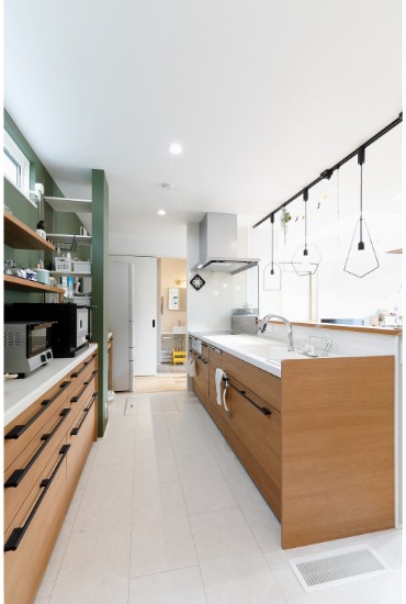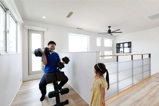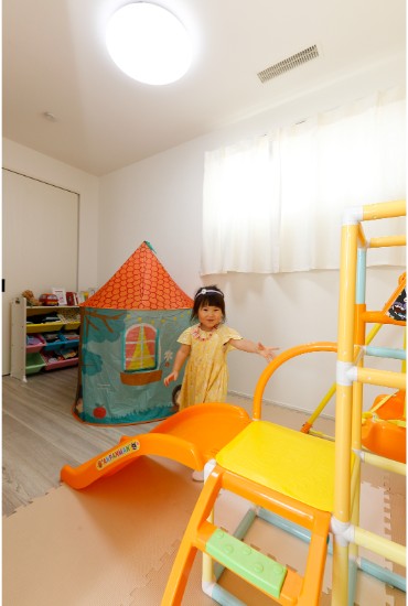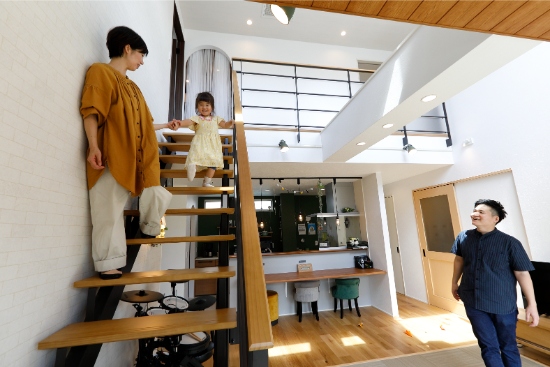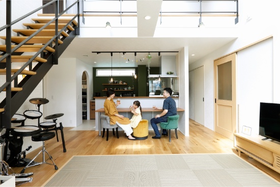 2階建|延床 約34坪|敷地 約63坪 安心できて、自分らしくいられる場所。 それがK様ご夫婦にとってのマイホーム。災害に強い構造やシステム、家事が楽になる間取り、快適室温の24時間換気システム。そんな機能に守られている安心感があるから、家族みんなが自分らしくいられるのです。 1.自分らしくいられる場所 2.成長と共に変化する空間 家族構成/ご主人、奥さま、お子様1人 建物/シンセ・スマートステージ 敷地面積/210.05㎡(63.54坪) 延床面積/1階:67.20㎡ 2階:45.95㎡ 快適さは想像を超えて大満足 全体が吹抜けとなったリビングは、掃き出し窓と吹抜けのフィックスからたっぷり陽の入る、明るく開放的な空間です。床にはテキスタイルフロアを採用し、ソファを置かずに直座りするスタイル。ご主人のドラムに合わせてダンスを踊るなど、家族のメインステージとなっています。キッチンには、ダイニングテーブルの代わりとなるカウンターを配置し、省スペース化と配膳の動線も効率化を実現し、使い勝手の良さも実感しています。 家族と共に変化する空間 広々使えるリビングは、いずれはソファを置いてゆったり使用することも。寝室は、床に濃い色を選び落ち着いた印象に、現在は、ご主人の在宅勤務時の書斎として利用し、ベットを置かず布団で川の字になって就寝しています。2階の洋室も今は、大型玩具を置いてお子様のプレイルームとなっていますが、就学時には個室の勉強部屋にと、それぞれの部屋が、家族の成長と共に変化していく空間使いが可能となっています。 玄関の土間収納はオープンスタイルで大きな物の出し入れも容易です。 リビング側からシンクやコンロが見えないようカウンターの高さを調整したキッチン。玄関からの動線もスムーズ。 将来の子ども部屋。現在はプレイルームです。 キーワード スマートハウス 吹抜け 家事ラク動線 面積 〜35坪まで