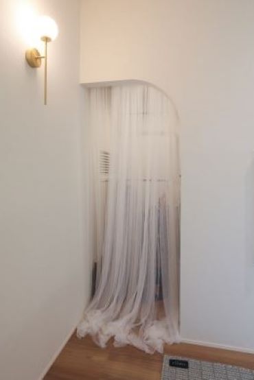 家の雰囲気に合う、1/4形状の垂壁をシューズクロークの入口に。収納内が見えにくくなる効果も