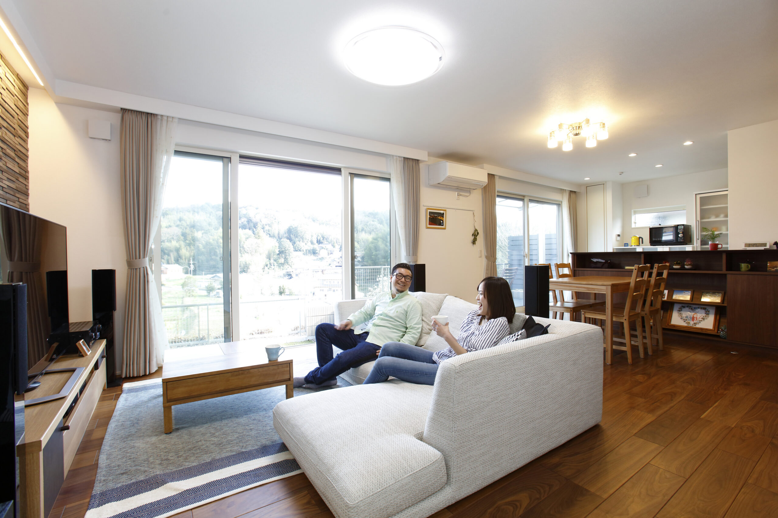 南東の眺望を借景にしたLDKは約20帖。 高さ240㎝のドアや、タイル壁面に奥行きを持たせ、カーテンボックスと一体にするといった細やかなこだわりによって、より開放感を印象付けています。