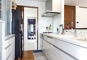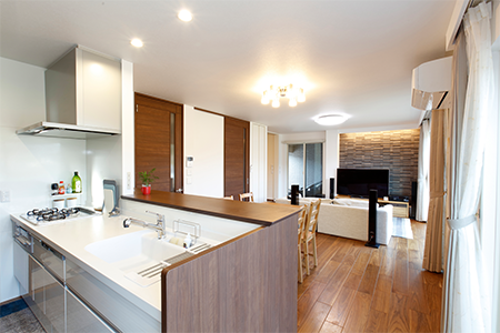 南側に広がるワイドなLDKはご夫婦がどこにいても一緒にテレビを観たり会話をしたり、同じ時間を共有できる空間に仕上がっています。 また、キッチンに立ってLDKを眺めると、奥にはインナーガレージの様子も見ることができます。 趣味の空間であるガレージを手に入れつつ、奥さまと過ごす家の中もゆとりと快適性が共存する空間に。