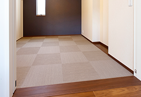 床の間がフローリング調など、現代風の和室。畳のカラーなども抑えたトーンで和モダンな印象。