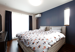 アクセントクロスとカーテンのお色目を揃えて、落ち着いたコーディネートの主寝室。