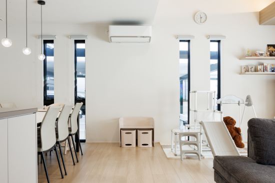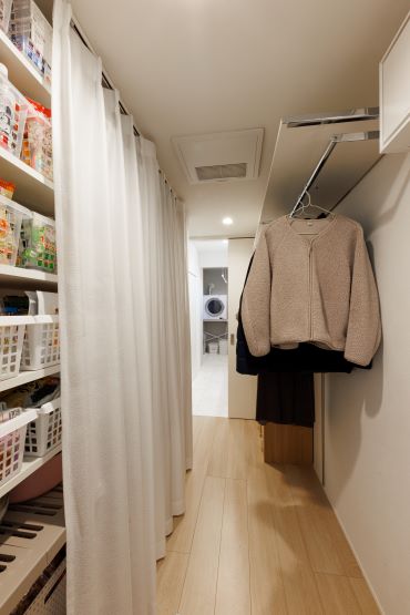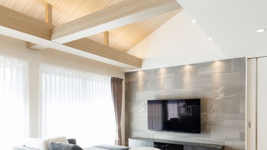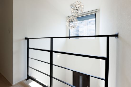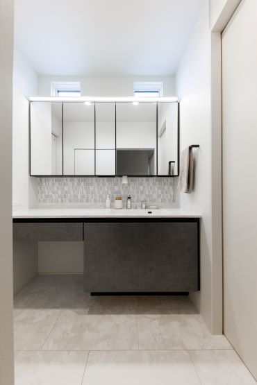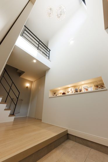 2階建|延床約48坪|敷地約233坪 人が集い、時を育む家 人が自然と集う場所、リビングの大空間が 暮らしの核となる住まい 1.みんなが集まれる大空間 2.生活動線のスムーズさを考慮した間取り 3.自然光を取り込んだ明るい住まい 家族構成/ご主人、奥さま、お子さま2人、おばあさま 建 物/シンセ・スマートステージ 敷地面積/233.98㎡(70.77坪) 建物面積/1階:96.30㎡ 2階:62.67㎡ 延床面積/158.97㎡(48.08坪) 梁の上の間接照明が、天井をやさしく照らしてくれます 自然とみんなが集まってくる大切な場所。 天井のウッドのニュアンスが心を落ち着かせてくれます。 吹き抜けの大きな窓から自然光を取り込んで明るさを確保 大きな窓からの自然光は全体を明るくして くれます。吹き抜けに吊ったデザイン性の 高い照明は、中からも外からも見える仕様に。 吹き抜けで開放感があり、目の前に見える階段もおしゃれな玄関。統一されたカラーコーディネートでまとまりのある空間に。 リビング→パントリー・クローゼット→洗面室→脱衣所・ランドリーを直線でつなげた生活動線に優れた間取り。 高級感と清潔感があって広くておしゃれ。すべてを満たした洗面室はこだわりが詰まってます。 キーワード モダン外観 二世帯住宅 吹抜け 家事ラク動線 面積 45坪以上