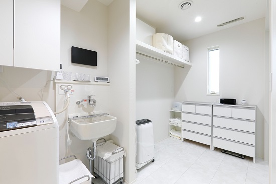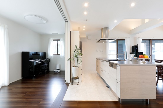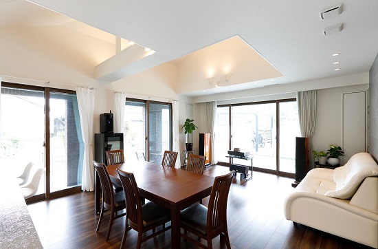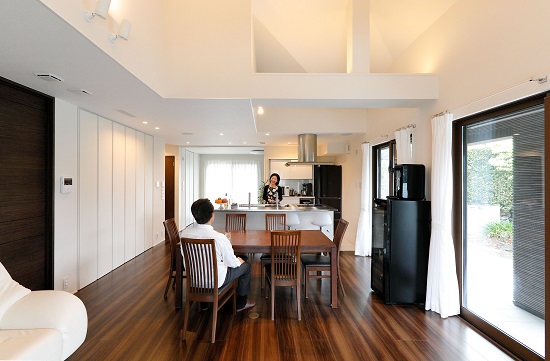 平屋|延床 約34坪|敷地 約121坪 時間と空間で寛ぎを創出した、心を潤す平屋 趣味が多彩で人生の味わいを知る素敵なミドルエイジで、その一方、社会的には責任世代といわれるY様ご夫妻。だからこそ、マイホームは寛げる場所にとリクエスト。完成したのは寛ぎに加えて好奇心を満たす非日常の空間。大人なお二人にふさわしい邸宅です。 1. 開放的で寛げる空間 2. 家中がつながる回遊動線 3. 多様なシーンで家を楽しみつくす 家族構成/ご主人、奥さま 建物/シンセ・ピアーナ 敷地面積/401.95㎡(121.58坪) 延床面積/113.13㎡(34.22坪) 余裕を作り出す、ハイブリッド動線を実現した機能的な間取り ウォークスルーのファミリークローゼットや、リビング収納といった作り付けの収納を家の中心に集め、すべての部屋を一周で回れる平屋ならではの回遊動線と、利用頻度の高いキッチン・洗濯室をつなぐI動線のハイブリッド動線を実現。帰宅後の手洗いや着替え、片付けや掃除は回遊動線が、料理をしながら洗濯をする時にはI動線が活躍し、日常ルーティンを流れるようにこなすことができます。また、時間や天候を気にすることなく洗濯からアイロンまでできる洗濯室は、スマートエアーズ導入で、数時間でカラリと乾きます。 オフタイムを自分流に楽しむ、シックで洗練されたLDK 見せ梁や屋根裏の勾配を巧みに使った吹き抜けのある空間設計や、その空間を立体的に魅せる照明演出、彫金を施したようなワークトップのキッチンや大ぶりの家具、そしてアウトドアリビングを作った広いテラスなど、それぞれのこだわりがひとつに。サラウンドシステムやホームシアターといった設備も備え、バーにいる気分でお酒を飲んだり、海外のレストランのようにテラスで食事をしたりと、家の中と外をシームレスに使い、自宅に居ながらにしてさまざまなシーンを楽しんでいます。 キッチンと洗濯室の間にある洗面室。玄関ホールからも直行できる動線が便利。 シンプルに仕上げた寝室。この部屋も回遊動線によってつながっています。 音響にもこだわって、好きなものを詰め込んだリビング。 キーワード スマートハウス 家事ラク動線 面積 〜35坪まで