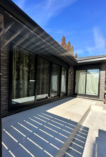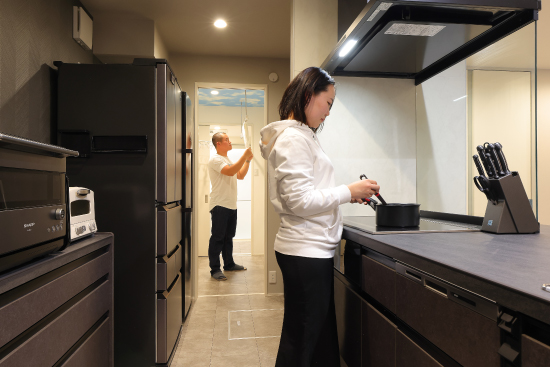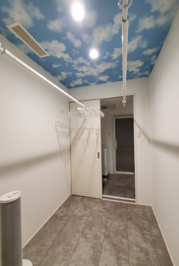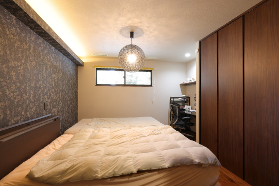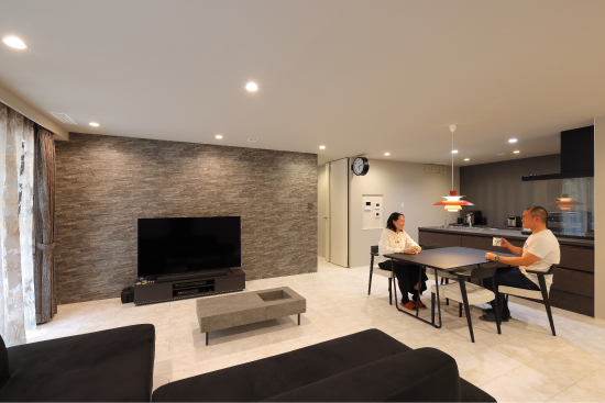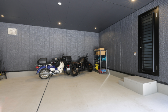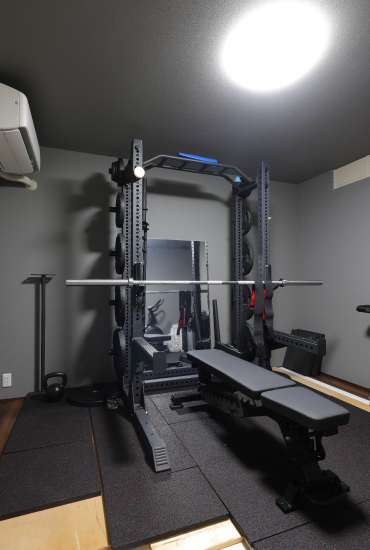 1階建|延床約51坪|敷地150坪 郊外の平屋で、愛犬とのんびり生活 車2台分の広々インナーガレージやご主人念願の筋トレルーム、そしてご夫婦が夢見た大型犬との生活…。街から少し離れることで、すべてを叶えました。 1.インナーガレージ 2.大型犬との生活 2.家事ラク回遊動線 家族構成/ご主人、奥さま 建 物/シンセ・ピアーナ(平屋) 敷地面積/499.00㎡(150.94坪) 建物面積/171.48㎡ 延床面積/171.48 ㎡(51.87坪) 平屋ならではの回遊動線 ご夫婦にとっても愛犬にとっても暮らしやすい平屋住宅。階段移動がないため、生活動線はシンプルです。さらに移動効率を高めているのが回遊動線。リビングからキッチン、パントリー、洗濯室、水廻りを抜けてリビングに戻ってくる動線とリビングから出発してファミリークローゼット、ゲストルーム、主寝室、ワンちゃんルームを廊下でつないだ動線が設計されています。特にキッチンから脱衣室までが一直線に連なる配置は、使い勝手抜群。動線上にウォークスルーのパントリーを加えて利便性を上げました。 プライベート空間は壁紙で遊ぶ 玄関やリビングなど、お客様も利用するパブリックスペースはシックにまとめていますが、洗濯室やファミリークローゼットといったプライベートスペースでは大胆なデザイン壁紙を採用。格好良さとかわいらしさのギャップに、ご夫婦の遊び心を感じます。また、各所に取り付けられた照明器具も空間の良いアクセントになりました。ダイニングはオレンジ、トイレは星形、主寝室は和モダンな球形など、印象深いアイテムをチョイスしています。 洗濯は室内干しがメイン。天井に青空と雲をプリントした壁紙を貼りました。いつでも晴天のようなすがすがしさ! トレーニングマシンに合わせてスペースを確保。ジムに通わなくても、いつでも筋トレが出来ます。 ワンちゃんルームから直接、テラスを抜けて庭へ行けます。家の中でも外でも、愛犬とのびのび過ごせます。 キーワード スマートハウス 家事ラク動線 車と楽しむ 面積 45坪以上