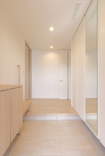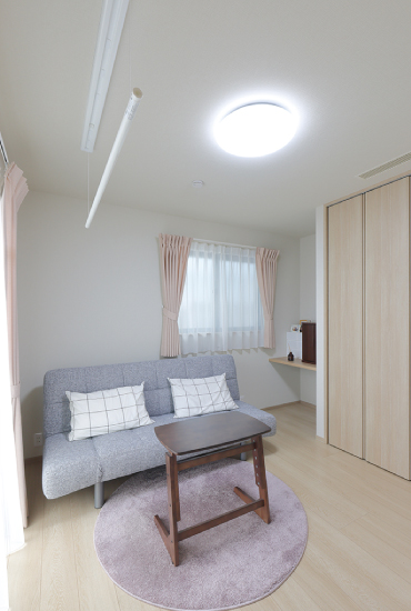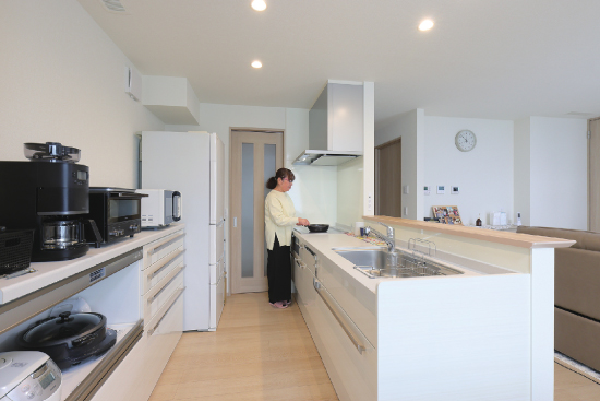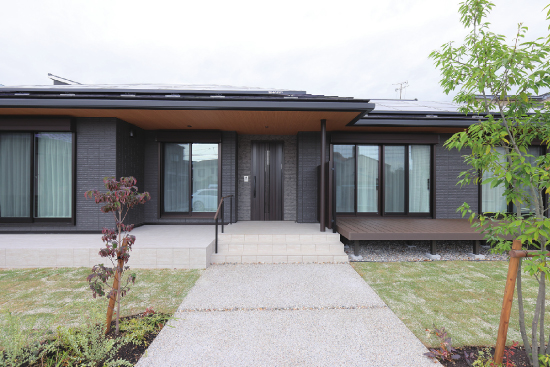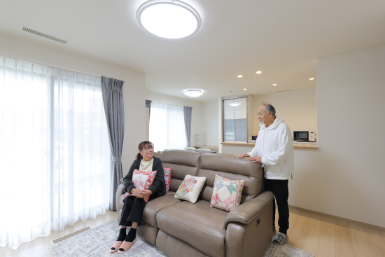 1階建|延床約44坪|敷地約87坪 独立性の高い平屋の二世帯住宅 「トヨタホーム&LIFE」の住み替えサービス「再適家」を活用して、お母さまのご実家を売却し、これまで暮らしてきた住まいを平屋に建替える計画を進めていたI様。同時期に長男さまの結婚が決まり、建替え後の新居に二世帯で同居することになりました。普段はそれぞれのプライベートを大切に暮らし、何かあった時にはお互いに助け合える。そんな程よい距離感で暮らせる平屋の二世帯住宅が完成しました。 1.二世帯住宅 2.程よい距離感 3.安心・安全な暮らし 家族構成/親世帯(お父さま、お母さま) 子世帯(長男さま、奥さま) 建 物/シンセ・ピアーナ(平屋) 敷地面積/290.00㎡(87.72坪) 建物面積/1階:146.62㎡(44.35坪) 延床面積/146.62㎡(44.35坪) 玄関のみ共用、ほぼ完全分離型 住まいのほぼ中央に共有玄関を配置して、入って左右をそれぞれの世帯エリアに。土地の広さを生かして、平屋でありながら各世帯の生活空間は完全に独立させることができました。親世帯がこだわったのは、安心・安全な暮らし。窓には防犯性の高い電動シャッターを設置。全館空調システム「スマート・エアーズ」で室内は快適な温度をキープ。平屋ならではの広い屋根を生かした太陽光発電を取り入れ、光熱費も節減できました。また、階段がないことで身体の負担が軽減されることも平屋の利点のひとつです。 ワクワクする遊び心のある空間 子世帯は、今後お子さまが誕生してからの事も考慮して設計しています。キッチンの前面に、ダイニングスペースを兼ねたカウンターを設け、料理をしながらリビングにも目が行き届きます。また、秘密基地のようなロフトがあったり、レンガ調のアクセントクロスをあしらったりと、間取りや内装にも遊び心が満載です。二世帯ということでどうしてもお互いの生活音が気になってしまいますが、そこは平屋ならではの上下ではなく左右に分かれていることで、それぞれの世帯に気兼ねなく過ごすことが出来ます。 住まいのほぼ中央に位置し、左右で各世帯エリアにわかれるエントランス。 親世帯の洋室。洗面室近くにあり、室内用物干しを設置。ここから庭にも出れます。 子世帯のリビングダイニング。ロフトを設けたことで高さが生まれました。 キーワード スマートハウス モダン外観 二世帯住宅 面積 40〜45坪まで