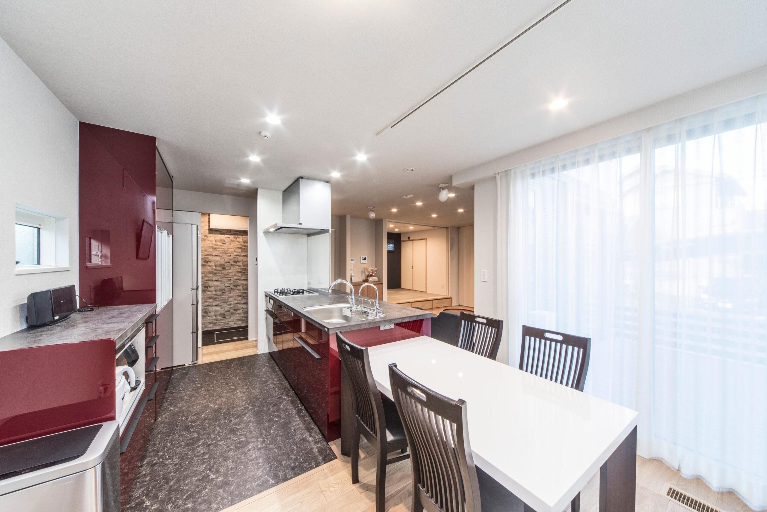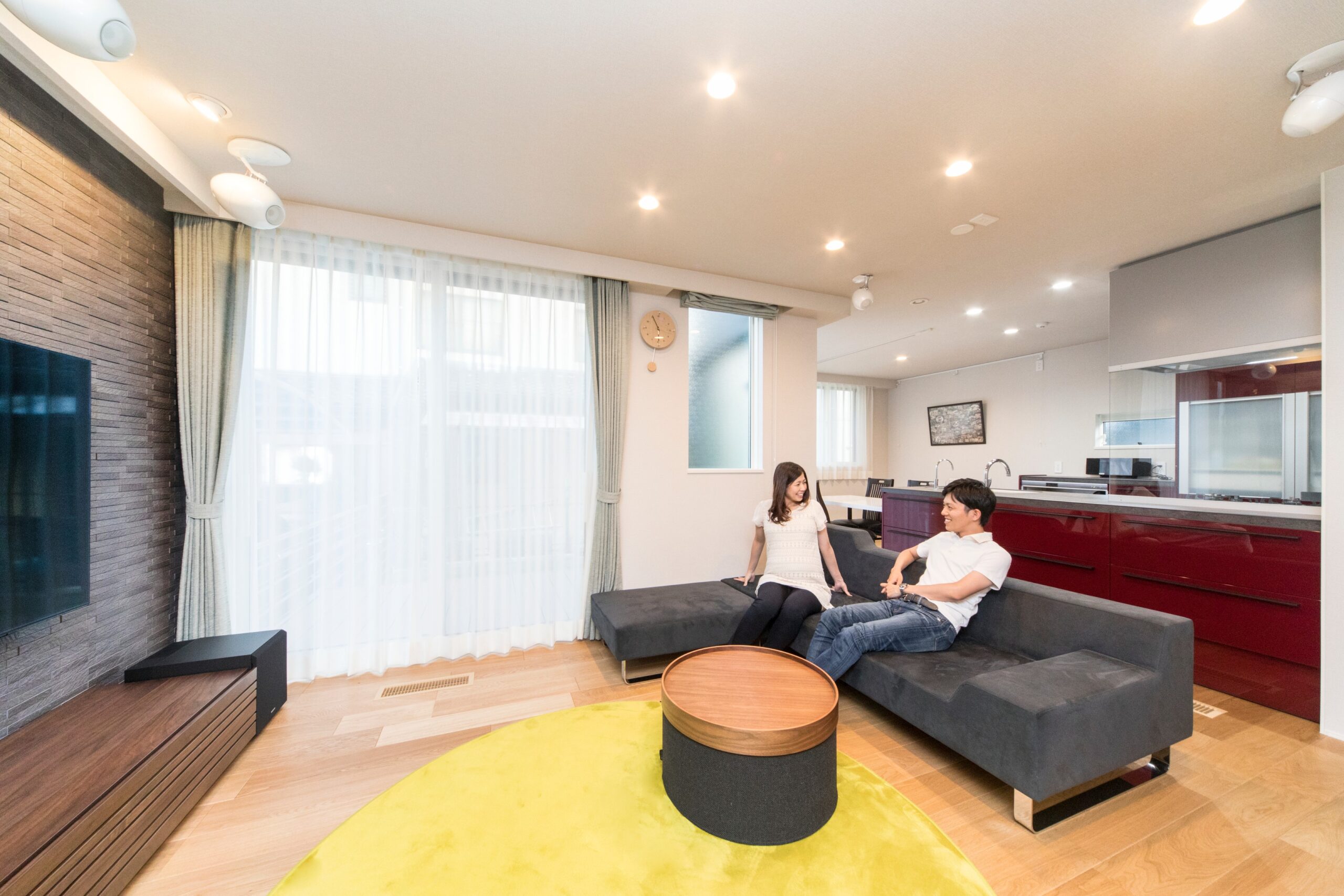 大空間が広がる明るいリビングルーム。リビングのアクセントにもなる正面のタイル壁には、防湿・消臭効果のある「エコカラット」を採用。また、ワインカラーが映えるお洒落なキッチンも、天板には熱い鍋をそのまま置けるセラミック天板を使用しています。