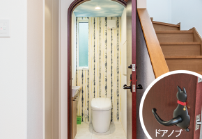 1階トイレの扉は奥さまのこだわりで丸みを帯びたデザインと猫の取っ手をオーダーメイド。遊び心と個性が感じられます。
