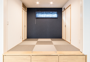 琉球畳と藍色のアクセントクロスを取り入れたモダンな和室。引き込み式の引き戸を閉めればプライベートルームにも。