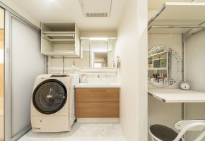 ワイドな洗面室は、収納スペースの他にドレッサースペースもあり、家事と身支度の両方を効率的に叶えます。