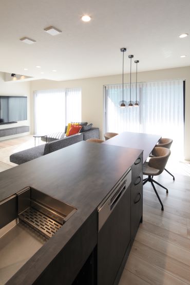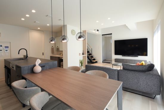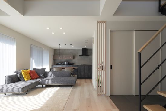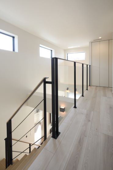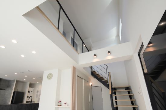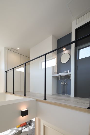 2階建|延床約36坪|敷地約248坪 開放感が広さを生む家 吹き抜けとスケルトンの要素を足すことで 空間が抜けつながりのある住まい 1.吹き抜けとスケルトンで開放感を 2.“使い方”を想像して工夫した配置 3.家へのこだわりが見える風景 家族構成/ご主人、奥様、お子様 建 物/シンセ・スマートステージ 敷地面積/248.16㎡(75.06坪) 建物面積/1階:66.39㎡ 2階:52.91㎡ 延床面積/119.30㎡(36.08坪) 吹き抜けとスケルトン階段による広さの拡張感 たっぷりと差し込む自然光のあたたかさが 開放感を演出してくれます。 計算されたレイアウト妙 玄関先のリビング扉から、リビングと キッチンへの視線が一直線に抜けるため、 実際の坪数以上にLDKに広さを感じます。 空間のアクセントとしても効いている2階のかわいらしい洗面室。丸い鏡と、あえてむき出しにした洗面台下部の配管がデザイン的。 玄関や1階からの吹き抜けの見え方を考えて、2階にはスケルトン腰壁を採用。 広さと明るさ、奥行きを感じます。 全体感を見渡すことができるダイニングは、座っていても居心地の良さを感じる場所。 キーワード モダン外観 吹抜け 家事ラク動線 面積 35〜40坪まで 45坪以上