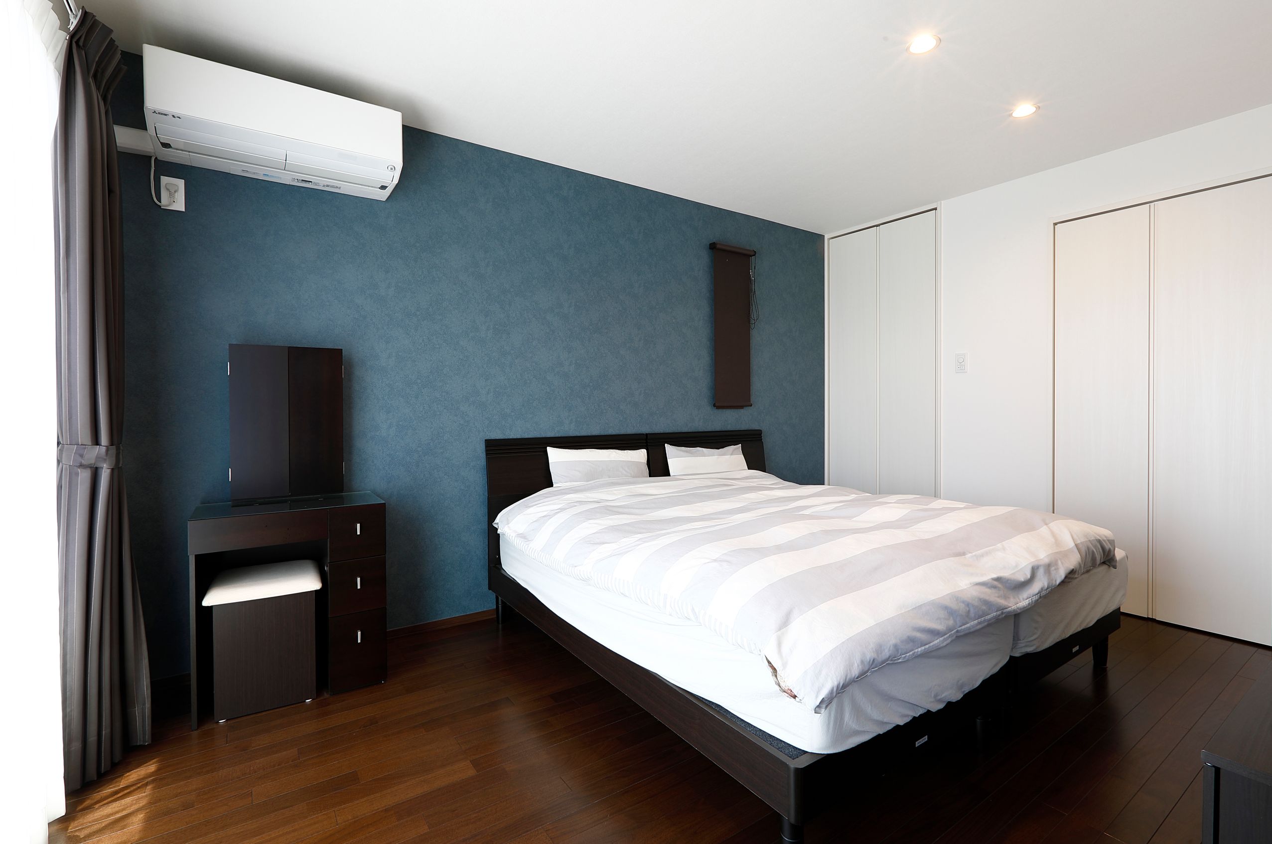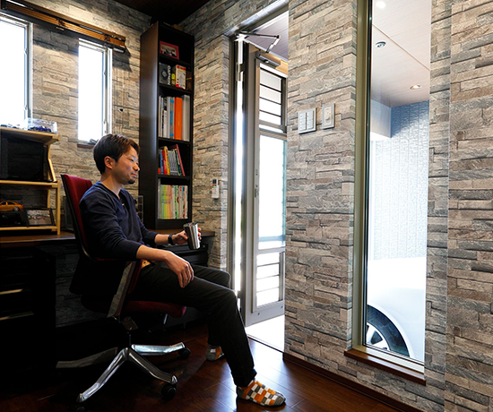 お酒を飲んだり、就寝前のひと時を過ごす書斎はご主人の憧れのひとつ。タイル調の壁紙で落ち着いた印象の書斎はインナーガレージへ出入りできるドアや、愛車を眺めることができる大きな窓を設けており、モダンでクールなガレージの外壁ともマッチしています。