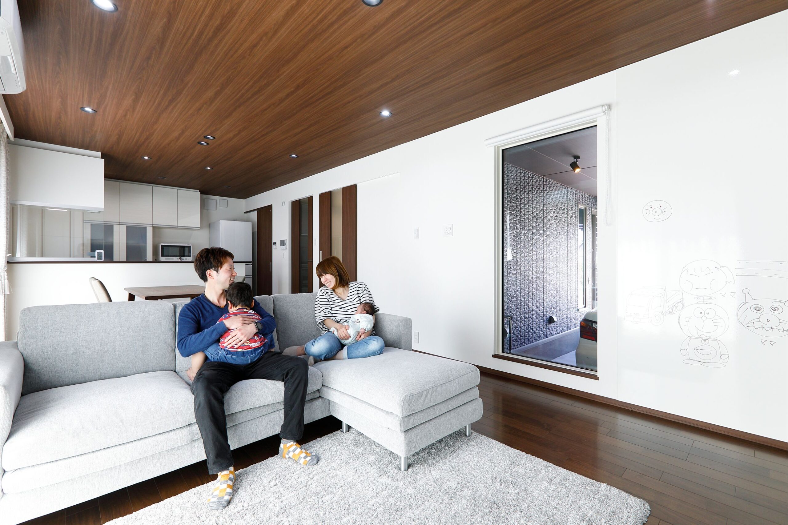 家族が互いの存在をいつも感じられる家づくりを目指して、5つのしかけが1階に家族が集まるよう意図しています。①子どもが必ずリビングを通るリビング階段。②パパの帰宅がわかるようにガレージがみえる窓③大型のマグネットボードが家族の伝言板に④1階のみにトイレを設置し引きこもり防止⑤子ども部屋はベッドと机が置ける程度の必要最小限の面積と随所に工夫が凝らされています。