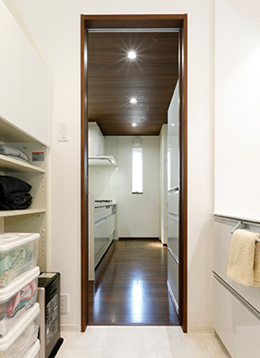 廊下側にも出入り口のある洗面室とキッチン。直線で行き来できるので、家事を並行して進めることができます。