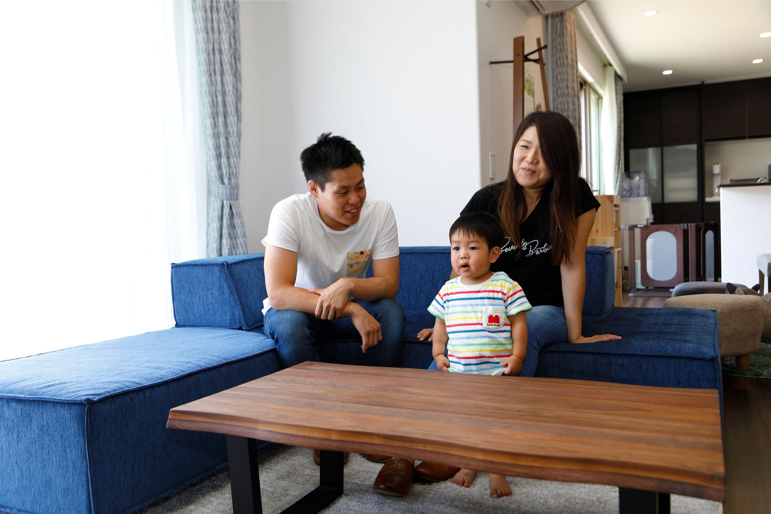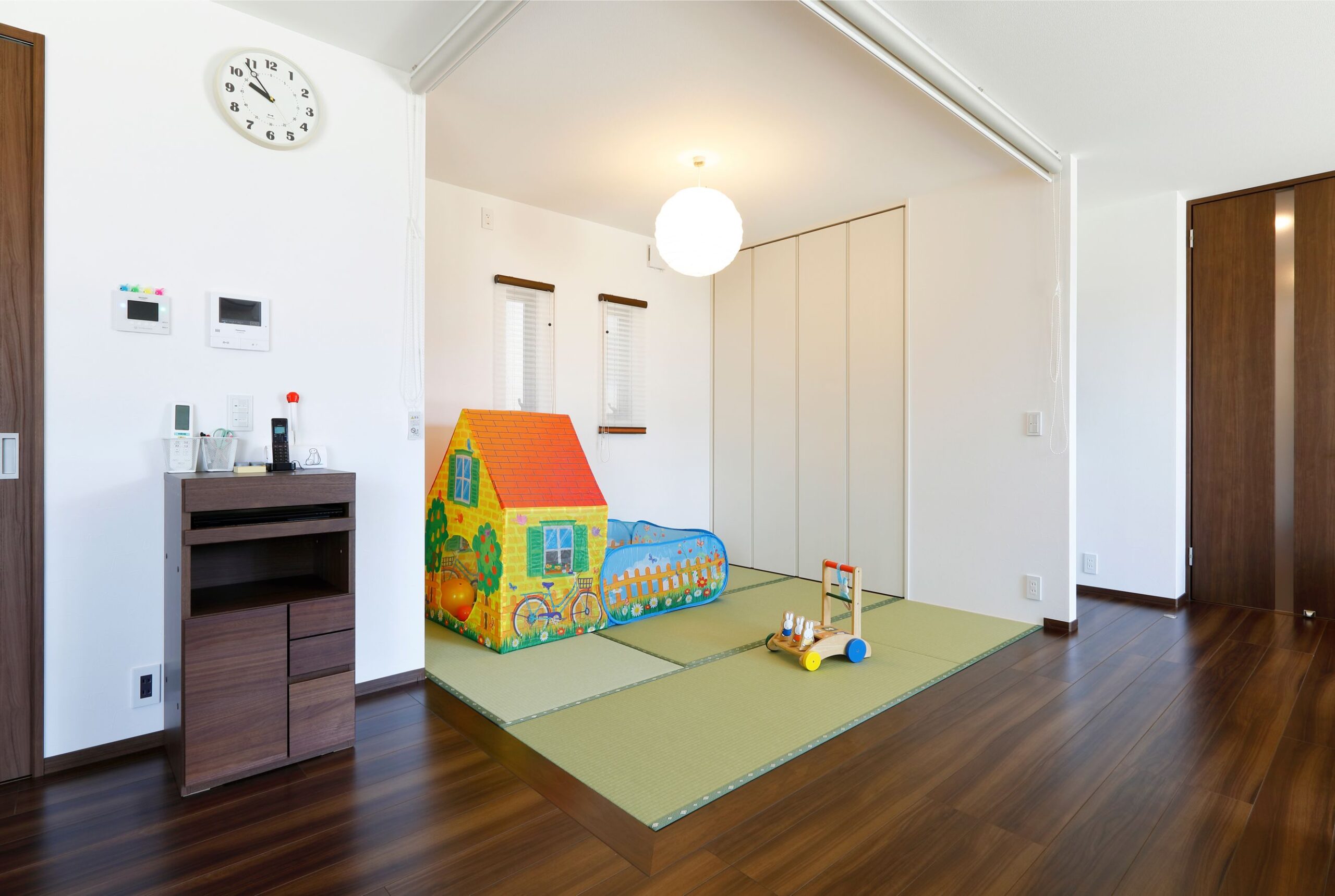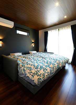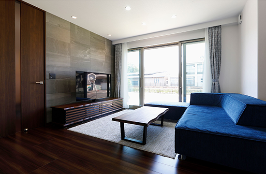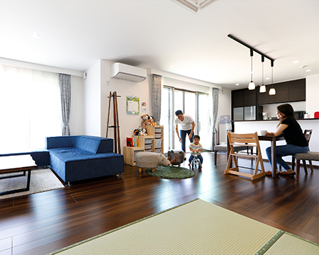 1階建|延床 約33坪|敷地 約116坪 子どもが走り回り家事もスムーズで快適。 平屋のマイホームを建てると決めたのは、身体に障がいのある奥さまが無理なく自立して暮らせる住まいをつくりたいという思いからでした。段差や動線など行動に負担や無理がなく安全に配慮されていること、一年を通して室温が心地いい24時間空調システム、そして外と中がつながる開放感。誰もが暮らしやすい住環境をデザインしたら、身体だけでなく心にも優しいワンランク上の快適さを実感するマイホームになりました。 1. 上下移動がなく将来も安心な暮らし 2. LDKから寝室まで見渡せるレイアウト 3. 南に面した居室が多く、明るい室内 家族構成/ご主人、奥様、お子さま1人 竣工年月/2019年3月11日 建物/シンセ・ピアーナ 敷地面積/386.77㎡(116.99坪) 延床面積/111.41㎡(33.70坪) パブリックとプライバシーなスペースを隔てる 共働きのご夫妻が重視したのが部屋の配置。生活の中心となるLDKは西側に、寝室や子ども部屋は東側にレイアウトして、家族や来客の集まるリビングとプライベートな居室のあるエリアを東西で分けました。それぞれの動線がシンプルになるよう、トイレと洗面を各2箇所設けております。 ウォールナット調の落ち着いた空間 落ち着いた色調・デザインのエコカラットを用いたT Vボード側の壁。夜にはダウンライトが深い陰影を描き出します。 天井も床と同じダークな木目調にすることで、空間が低く感じられて落ち着くという寝室。 LDKの一角をマグネットウォールにしています。お絵かき用にホワイトボードを貼り付けたり、作品を飾るお子さま用のコーナーです。 背面との距離を広くとったので二人でも悠々と動くことができるキッチン。パントリーが隣接していて便利です。 キーワード スマートハウス 家事ラク動線 自然や庭を楽しむ 面積 〜35坪まで