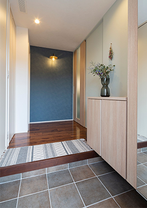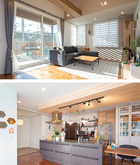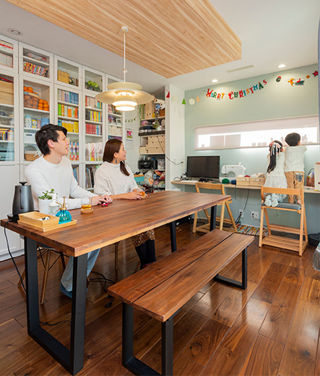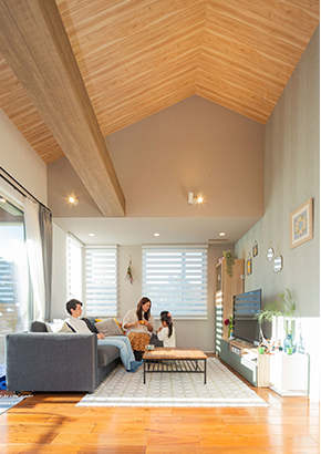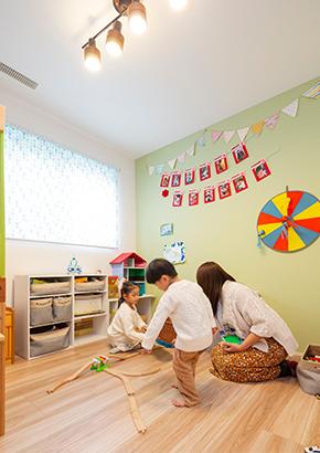 1階建|延床 約33坪|敷地 約63坪 心と体を伸びやかに育む明るい空間に弾ける家族の笑顔 明るく元気なエネルギーを発するS様邸のLDK。中心になって家づくりを進められた奥さまは家族が楽しく過ごせる間取りやインテリア、そしてお子さまの感性を刺激する仕掛けを考えました。もう一つのポイントが、 「整え過ぎない」ということ。間取りや素材、デザインにとことんこだわりながら、どこかラフな部分を残す遊び心。そのさじ加減は「80%」だそう。 残り20%のゆとりが、居心地満点のマイホームを創り出しました。 1. 家事や生活の動線がスムーズな平屋 2. 家族が集まりたくなる明るくて楽しいLDK 3. 使う場所で片付ける収納 家族構成/ご主人、奥様、お子さま2人 竣工年月/2020年3月29日 建物/シンセ ピアーナ 敷地面積/209.18㎡(63. 27坪) 延床面積/110.36㎡(33.38坪) 子育て世帯ならではの視点で考えられた間取り 陽当たりのいい角地に、平屋を建てられたS様。階段がない平屋は、掃除や洗濯といった家事動線もシンプルで効率的。安全面でもお子さまが小さな現在から、ご夫妻が高齢になる将来にわたっても安心です。また、家のどこにいても家族の気配を感じられるので、親子ともに安心感が増すという点も子育て中のご夫妻にとっての魅力です。また、ダイニングキッチンとリビングをクランク状に配置し、空間をさりげなく区切りながら、お子さまたちがくるくると走り回る動線に「曲がる」というリズムをプラスすることで、楽しい遊び場になりました。 子どもの「感性」と「自主性」を育むインテリア ダイニングの壁紙には、料理やスイーツ作りが趣味のご主人のパーソナルカラーをセレクト。パパの素敵な姿を、一緒に料理した思い出とともに覚えていてほしいという奥さまの想いです。また、スタディコーナーでは周囲の豊かな緑が借景となっている窓をあえて高い位置に設置し、お子さまが集中できるように配慮しています。ダイニングやスタディコーナーの近くに絵本や工作・手芸材料を、キッチンのリビング側の引き出しにおもちゃや上着をと、使う場所に収納場所を設置しました。お子さま自身で身支度やお片付けができるようになりました。 温かい色使いの子ども部屋。優しい空間ができあがりました。 玄関ホールの左右に設けたクローゼットには、靴はもちろん大型の荷物も収納。アウトドア好きのご夫婦は、キャンプ用品の出し入れも便利になったと大満足です。 表し柱が吹き抜け空間のアクセントになっているリビング。勾配天井と高さ240㎝の窓が開放感を高めています。 キーワード 吹抜け 家事ラク動線 自然や庭を楽しむ 面積 〜35坪まで