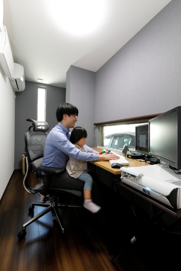 1階の書斎。集中するのにちょうどいい広さで、座った位置からインナーガレージの車がカッコよく見える窓の位置にこだわりました。
