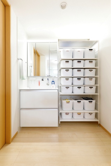 乾燥の終わった洗濯物も、ポイポイッと放り込むだけの収納で家事ラクを実現している洗面室。