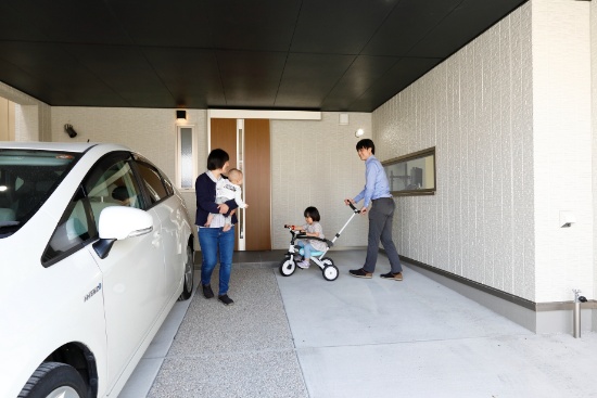 ご主人希望のインナーガレージは、床の洗い出しが玄関扉へのアプローチとなっています。雨の日の車の乗降や荷物の出し入れが便利だけでなく、水栓を完備しているのでプール遊びができる、郵便受けも雨に濡れないなど、ご家族にとってもいいことずくめ。また、玄関扉を、引き戸タイプにしたことで、扉が車のボディに当たる心配もなく、荷物を持っている時の開閉も楽になります。