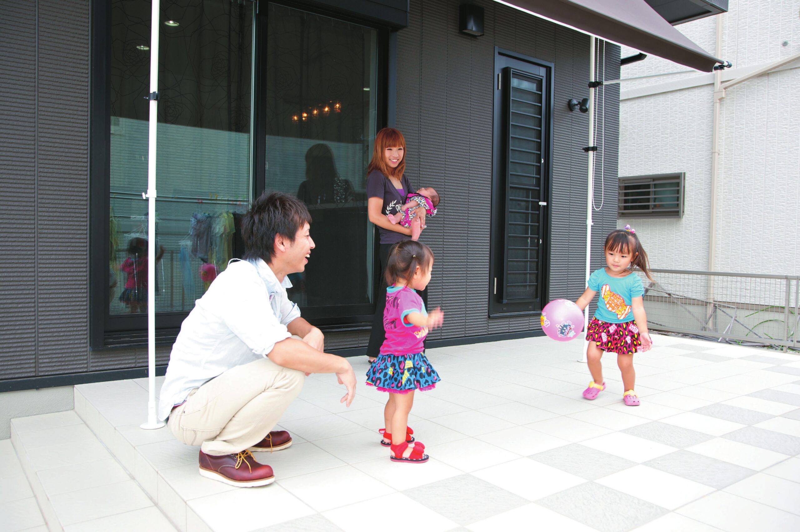 デッドスペースをうまく活用した効率的な収納スペースや、床暖房、ブラインドシャッターのエアリーガードなどの設備も充実。2階には3人のお嬢様のお部屋も平等に確保され、個性的なだけではなく機能性にも優れた住まいとなりました。また、リビング・ダイニングに続くテラスは、お子様のちょっとした遊び場や、アウトドアリビングとして活躍。タイルテラスだから、耐久性もあり汚れも洗い流せるので非常に便利です。
