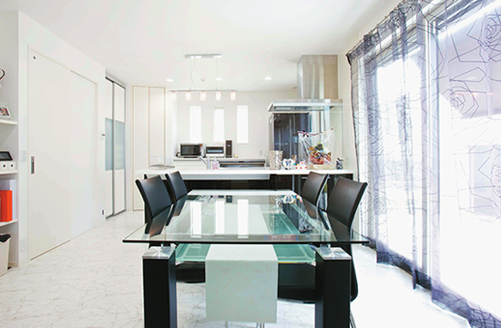 リビング・ダイニングは、真っ白なベースカラーにソファやラグの黒をアクセントに。全体をモノトーンで統一しました。床には汚れやキズにも強い大理石調のフローリングを採用しています。ご夫婦お気に入りのシャンデリアが、優雅な気品を漂わせています。どの部屋も画一的にならないよう、素材やカラーリング、インテリアにこだわりました。