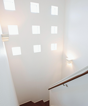 階段には明かり取りの9連窓を設置。外観のモダンなアクセントにもなっています。