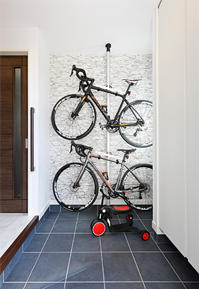 ラックに収納した自転車が、実用を兼ねたインテリアになっている玄関。土間に設置したクローゼットには、趣味の道具や洗車用品などを収納