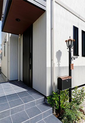 あえて西向きに設置し、玄関ドアが正面からは見えないことで、外観デザインがすっきり