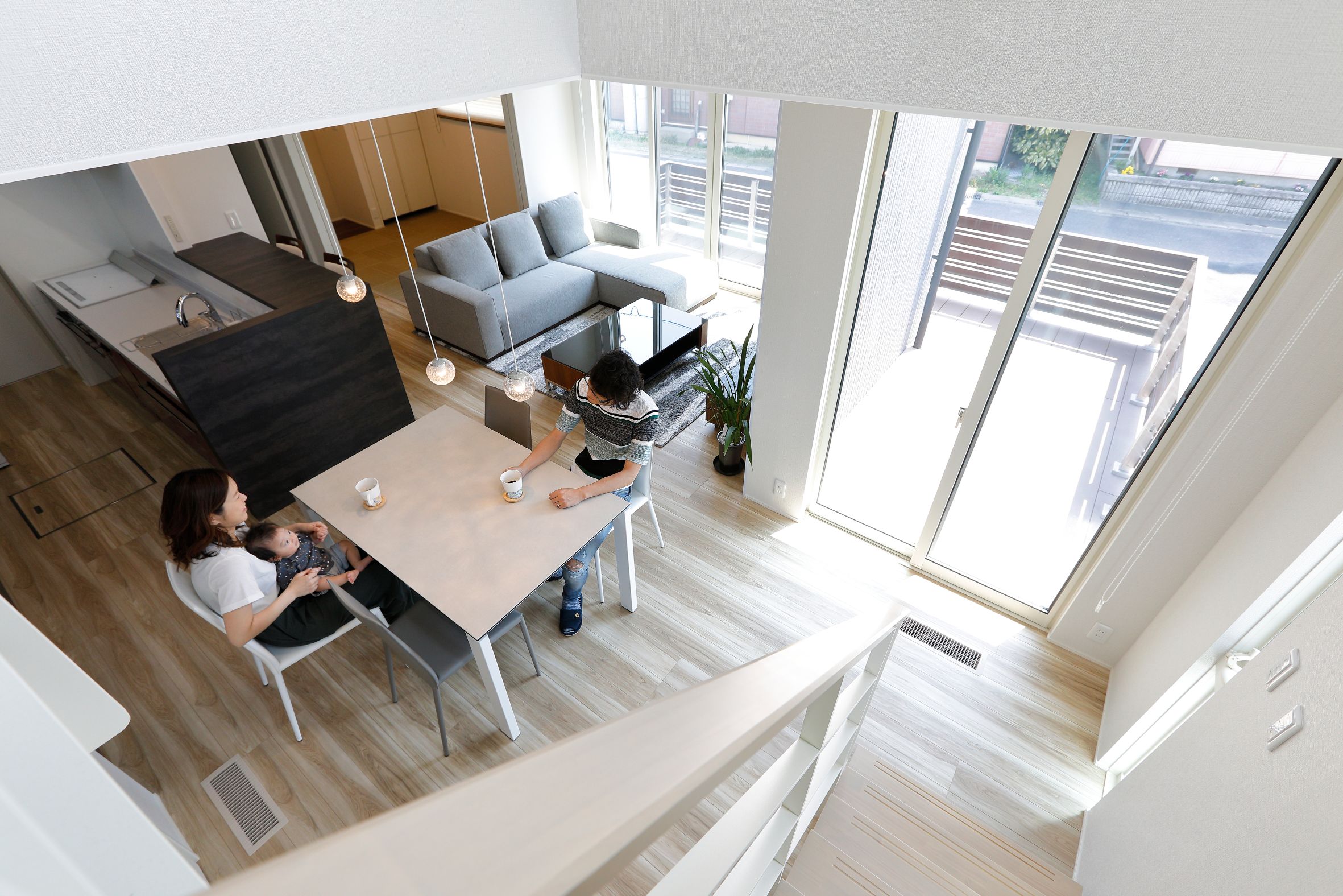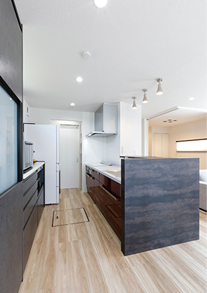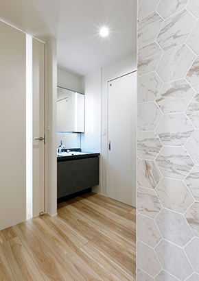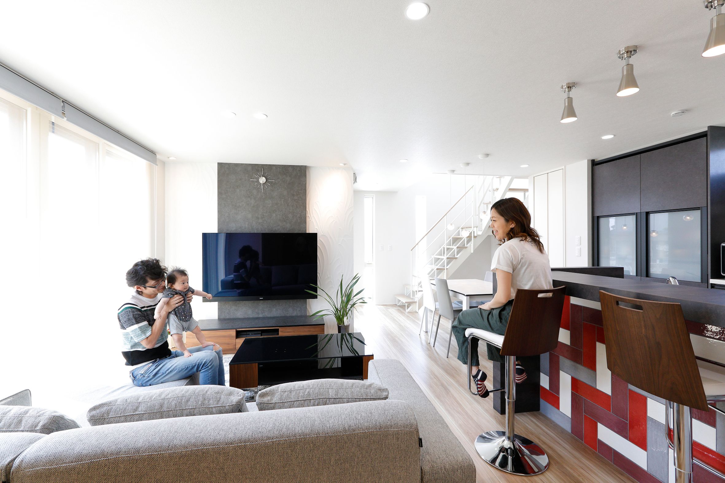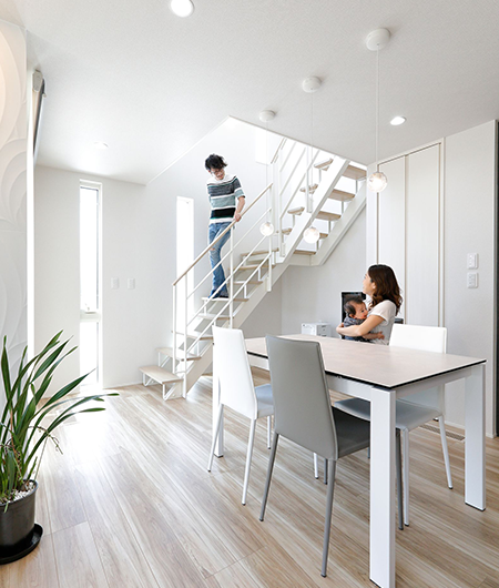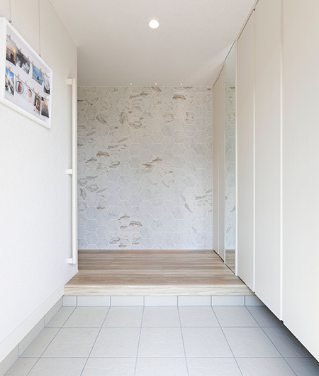 2階建|延床 約38坪|敷地 約56坪 LDKを真ん中に、居心地よさを求めた 家づくり。 家に帰ればリビングに家族が集合。尽きることのないおしゃべり、途切れることのない笑い声。居心地がよくて安心できる、実家での思い出を大切にする奥さま。マイホームに求めたのもそんな空間。家事がしやすい配置をおさえながら1階のどこにいても声が届く距離感。それぞれの趣味を取り入れながら調和したインテリアが魅力のT様邸です。 1. 壁にタイルをアクセント使いし、個性を演出 2. 玄関からリビングの通り道に洗面室を配置 3. アクセントクロスの色や照明で癒し空間を作った寝室 家族構成/ご主人、奥様、お子さま1人 竣工年月/2019年12月6日 建物/シンセ・はぐみ 敷地面積/185.49㎡(56.11坪) 建物面積/1階:64.24㎡ 2階:64.24㎡ 延床面積/128.48㎡(38.86坪) 実家での思い出や暮らしを参考に。 ご結婚前、ご実家ではいつも家族みんなでにぎやかに過ごしていた奥さま。おしゃべりや笑い声が絶えないご実家のリビングの幸せな時間をマイホームでも叶えたい。その意向を間取りに反映し、浴室、脱衣室、洗面室を東側にまとめ、階段は西側に配置。LDKと引き戸を全開するとリングとひと間続きになる畳コーナーが家の中心となり、家族がお互いの様子を感じあえる一つの空間を作り出しました。 居心地と個性を高めるタイルの使い方 玄関はさりげなく絵画のように、キッチンには奥さまが選んだ鮮やかな幾何学模様を、リビングには白のレリーフタイルに、壁に凹凸をつけるふかし壁を組み合わせたご主人好みのモノトーンと、空間に彩りを添えながらスタイリッシュに仕上げられています。 ダイニング、キッチン、脱衣室を一直線に配置。家事を同時進行でき効率的。 玄関ホールから直通できる1階の洗面室。手洗いを済ませてからLDKへ入室できます。 シフト勤務のご主人が昼間でもゆっくり休めるよう、クロスやカーテンを濃い色調でまとめた寝室。照明も癒しを演出。 キーワード モダン外観 吹抜け 家事ラク動線 面積 35〜40坪まで