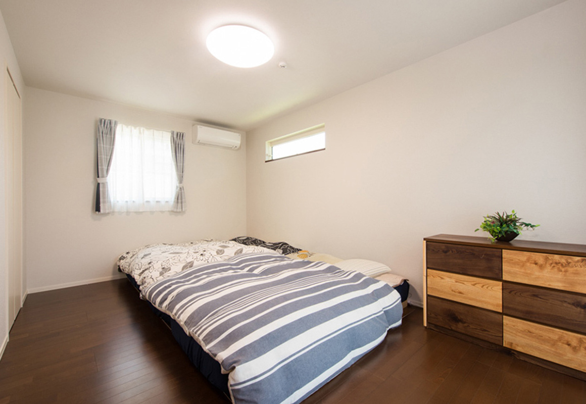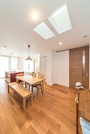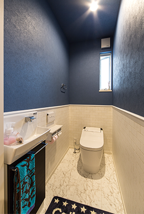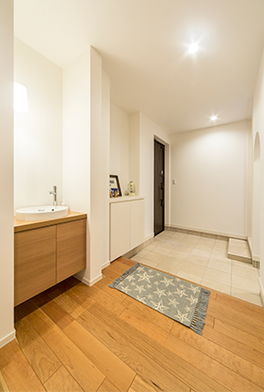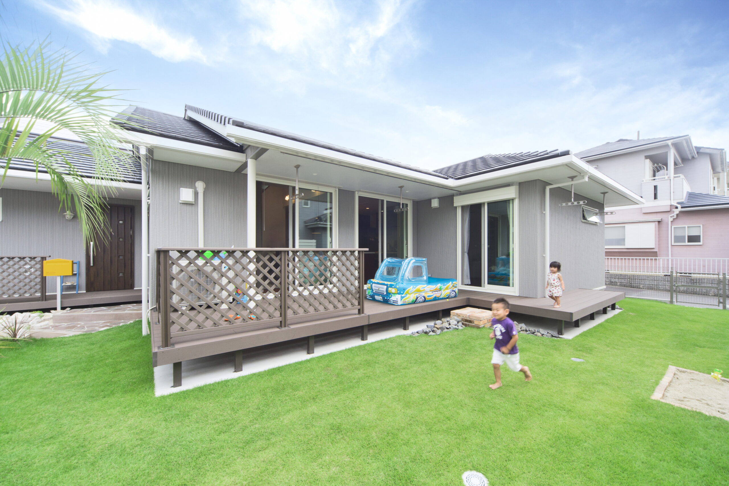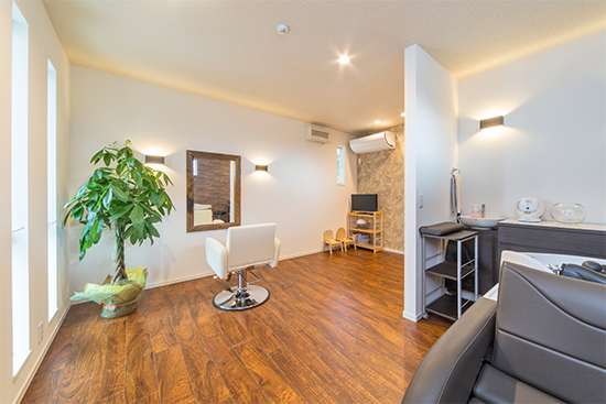 1階建|延床 約40坪|敷地 約100坪 自分らしくいられる心地よい暮らし 「自分たちらしい、オリジナルな家」を実現するため、芝生の庭とウッドデッキが室内と一体化するようなL字の建物設計や美容師の奥さまのために美容室併設、理想とするアメリカンテイストな外観デザインなど。オリジナル性を詰め込んだこだわりの住まいです。 1. リビングから階段で上がるロフト 2. 奥様こだわりの美容室併設 3. 玄関にミニ洗面コーナー 家族構成/ご主人、奥様、お子さま2人 竣工年月/2016年3月21日 建物/シンセ・スマートステージ 敷地面積/330.59㎡(100.00坪) 建物面積/1階:133.65㎡ 延床面積/133.65㎡(40.42坪) リビング上のロフトは楽しい遊び場 土地の広さを活かした庭を囲むような平屋建てのプランニングは、家の中や庭を行き来しながらお子さまが元気に走り回り、家族のふれあいを育みます。リビング上にはロフトをつくり、『LDKから子どもの気配がよくわかります。」と奥さま。小屋裏空間を活かした開放感ある高天井には、シーリングファンを設置。美容師の奥さまのために、美容室併設も希望のひとつであったため「自分たちらしい、オリジナルな家になりました」とK様。 アメリカ西海岸を思わせるデザイン 最初は木造メーカーで検討していたK様。納得のいくまでプランを何度も練り直し理想のデザインを追求しました。アッシュグレイの外壁に白い窓枠、カバードポーチのような玄関が印象的な、アメリカの西海岸を想わせるK様の住まい。併設している美容室の内装では、ウッドブロック柄やハワイアンテイストのクロスを使いナチュラルな雰囲気に。お客さま用の手洗いコーナーも設けられております。 深いブルー×白いレンガのクロスで、リゾートテイストを演出したトイレ。 キッチンと横並びのダイニング。トップライトからの光で明るさたっぷり。 玄関にミニ洗面コーナーとトイレを設置して、美容室のお客さまも気兼ねなく使えるような工夫を。 キーワード 吹抜け 店舗/賃貸併用 自然や庭を楽しむ 面積 40〜45坪まで