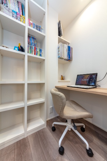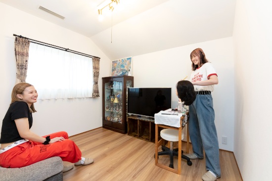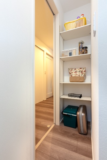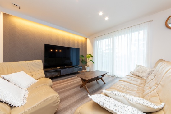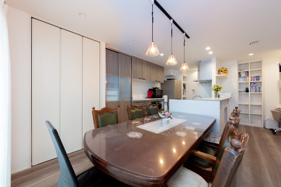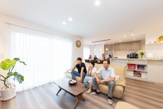 2階建|延床 約52坪|敷地 約109坪 みんなが一緒の空間とプライベートの空間。どちらもアル家。 ご両親が建てた家に増築をして、リビングも世帯別だった前の家。新しい家では、家族全員が一緒に過ごせる場所を作ることが一番の望みでした。 みんなが健康で幸せに暮らせるよう家相にも配慮。7人と一匹の仲良し家族が、絆を深めるマイホームです。 1.三世代同居 2.家族のだんらん 3.個性を活かしたプライベート空間 家族構成/ご主人、奥さま、お子様3人、ご両親 建物/シンセ・スマートステージ 敷地面積/363.12㎡( 109.84坪) 延床面積/1階:99.87㎡ 2階:71.89㎡ 仲良し家族のだんらん。~集う場所をあちこちに~ 盛り上がる会話、弾ける笑顔、その賑やかな様子が日常の風景となっているI様邸のLDK。2階にはI様ご夫妻の寝室とお子さまたちの自室に加え、ホールに話し声や生活音が就寝後のご両親の邪魔にならないよう配慮した、セカンドリビングとなるマルチスペースを配置。現在は美容学校に通われるお嬢さまたちが実技の練習に使用するなど、自由空間としても活用されています。 思い出を共存させた、愛あるマイホーム リビングとダイニング、キッチンそれぞれの役割をはっきりとさせながら、全体でひとつの空間を形作り、どこにいてもそれぞれの顔が見える核となる場所です。LDKのどこからでもテレビを観ることができるのでスポーツ観戦で盛り上がることもしばしば。ソファは前宅のものを用い、新しさの中に思い出を共存させた温かみのある空間に。 クリーム色の外壁に映える木調の玄関扉 キッチンと廊下の動線に作ったパントリー。LDKからは見えない位置にあるのも奥さまのお気に入り。 LDKの一角にカウンターデスクを設置。PCや読書コーナーとして家族で利用。 キーワード スマートハウス 二世帯住宅 家事ラク動線 面積 45坪以上