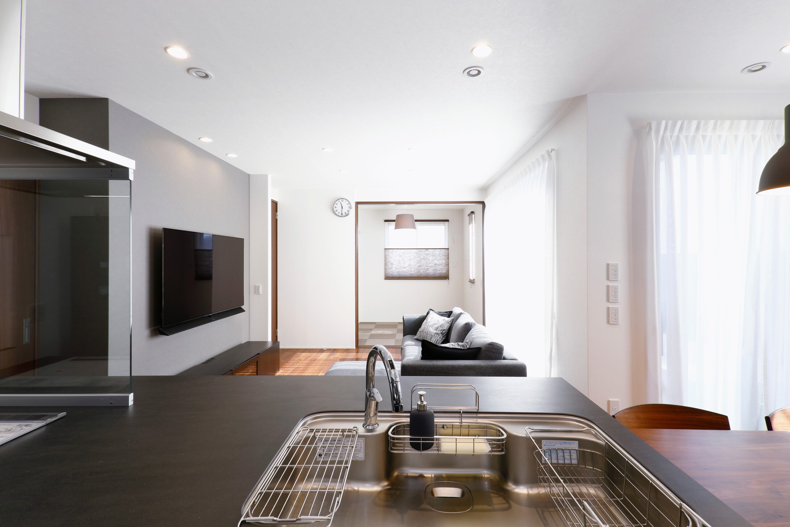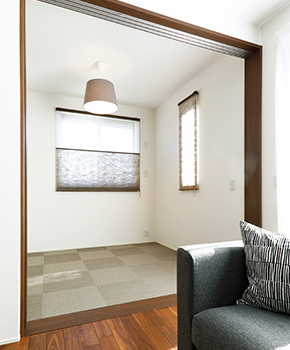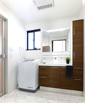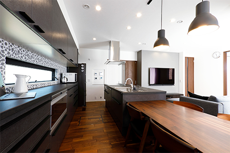 2階建|延床 約35坪|敷地 約71坪 海外ドラマに憧れて家事もはかどるキッチンの家 海外ドラマがお好きだという奥さま。家を建てる時イメージしたのはアメリカンな邸宅。デザインで訪れた人を圧倒するアイランドキッチンを中心に、カッコいい家ができあがりました。天井が高く、通路にも余裕を持たせた広々とした空間で家族みんなの笑顔が光ります。 1. 暮らしの中心となるアイランドキッチン 2. 自然光が差し込む吹き抜け空間 3. ハイユニット採用で2.6mの天井高 家族構成/ご主人、奥様、お子さま2人 竣工年月/2018年4月27日 建物/シンセ・スマートステージ 敷地面積/237.00㎡(71.69坪) 建物面積/1階:64.39㎡ 2階:53.10㎡ 延床面積/118.05㎡(35.71坪) 家の顔となるアイランドキッチン キッチンを中心とした回遊動線には余裕を持たせ、子どもたちが思う存分走り回ったりご夫婦で一緒に家事をしたりするのに快適な広さがあります。リビングとの距離を近づけたキッチンからは、炊事をしながら家族の様子が確認できます。また、壁に掛けたテレビも炊事しながら観られるように、角度にこだわりました。キッチンのカップボードなど、生活感が隠れる収納を実施しています。 おでかけ前の気分を高める吹き抜け空間 朝、お出かけの時間は、フィックス窓からの自然光が心地いいという吹き抜け玄関。ご主人の帰宅の際には、お子さまたちが2階の廊下から顔を出してくれるそう。 LDKとひと間続きのスマート和室。テキスタイルフロアを採用し、フローリングとも違和感がありません。ご両親が宿泊する際は客間として使用されています。 二人が並んで使用できる広さの洗面室。共働きのご夫妻は、支度が同時にできる快適さを毎朝実感しています。 階段の壁に選んだのは絵画のように印象的なアクセントクロス。 キーワード 吹抜け 面積 35〜40坪まで