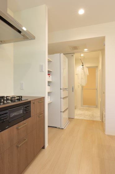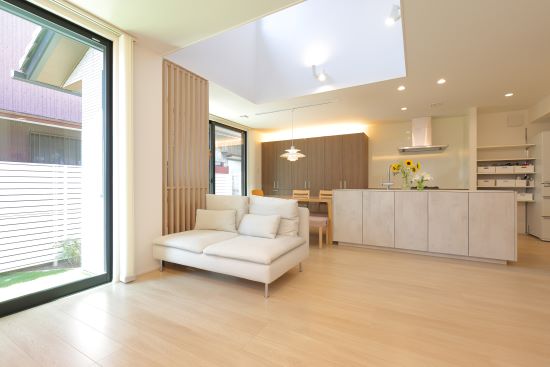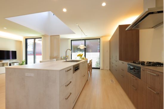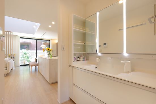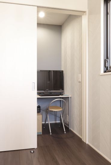 2階建|延床約37坪|敷地約47坪 限りある空間を無駄なく活用したこだわりの我が家 お子様の小学校入学を控え、家族の成長に寄り添える住まいを。 勉強も遊びも思い切り楽しめるよう考え抜いた間取りが秀逸です。 1.敷地を無駄なく活用した空間設計 2.光と解放感をもたらす吹き抜け 3.最短距離を意識した動線 家族構成/ご主人、奥さま、お子様 建 物/シンセ・スマートステージ 敷地面積/156.39㎡(47.30坪) 建物面積/1階:68.05㎡ 2階:57.44㎡ 延床面積/125.49 ㎡(37.96坪) 光と解放感をもたらす吹き抜けを暮らしの中心に お子様の成長のために、最も気にされたのが庭と採光。南側にも近接して住居があるため、LDKの中央に吹き抜けを配置することで上からの採光を確保しました。さらに南面に庭を設けたことで、リビングの窓からグリーンを眺められるように。風の通り道が生まれ、心地よい風が吹き抜けます。 家族の動きを想定し最短距離を意識した動線 出かける前の身支度や帰宅後のルーティンはなるべく簡潔に。洗面台と浴室を切り離し、洗面台を中心とした回遊動線を描きました。一方、家事動線は一直線に。キッチン、パントリー、洗面室、浴室を繋げました。洗濯は夜のうちに済ませて室内に干しておくことで、忙しい朝にゆとりが生まれます。 キッチンから浴室まで、見通し抜群。壁の陰になる部分に、収納棚や家電をすっぽりと納めました。 LDKの一角に、秘密基地のようなお子様用スペースを用意。お子様の勉強する様子を見ながら、家事をすることができます。 通常であればクローゼットになりそうなスペースを書斎としてワークスペースに。床や壁紙は落ち着いた色合いにしました。 キーワード スマートハウス 吹抜け 家事ラク動線 面積 35〜40坪まで