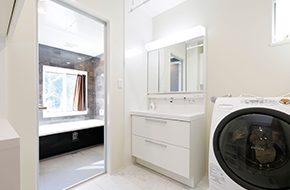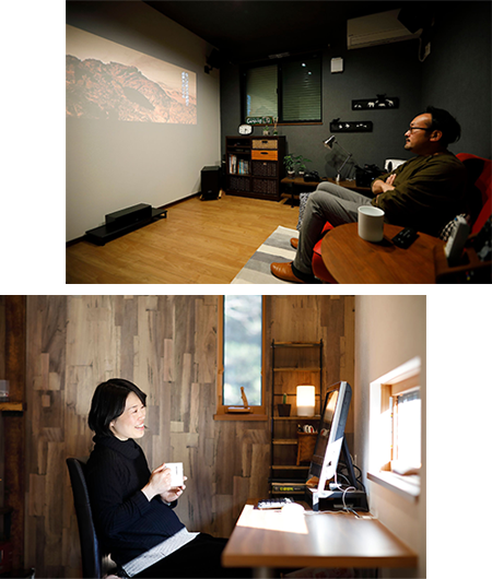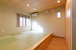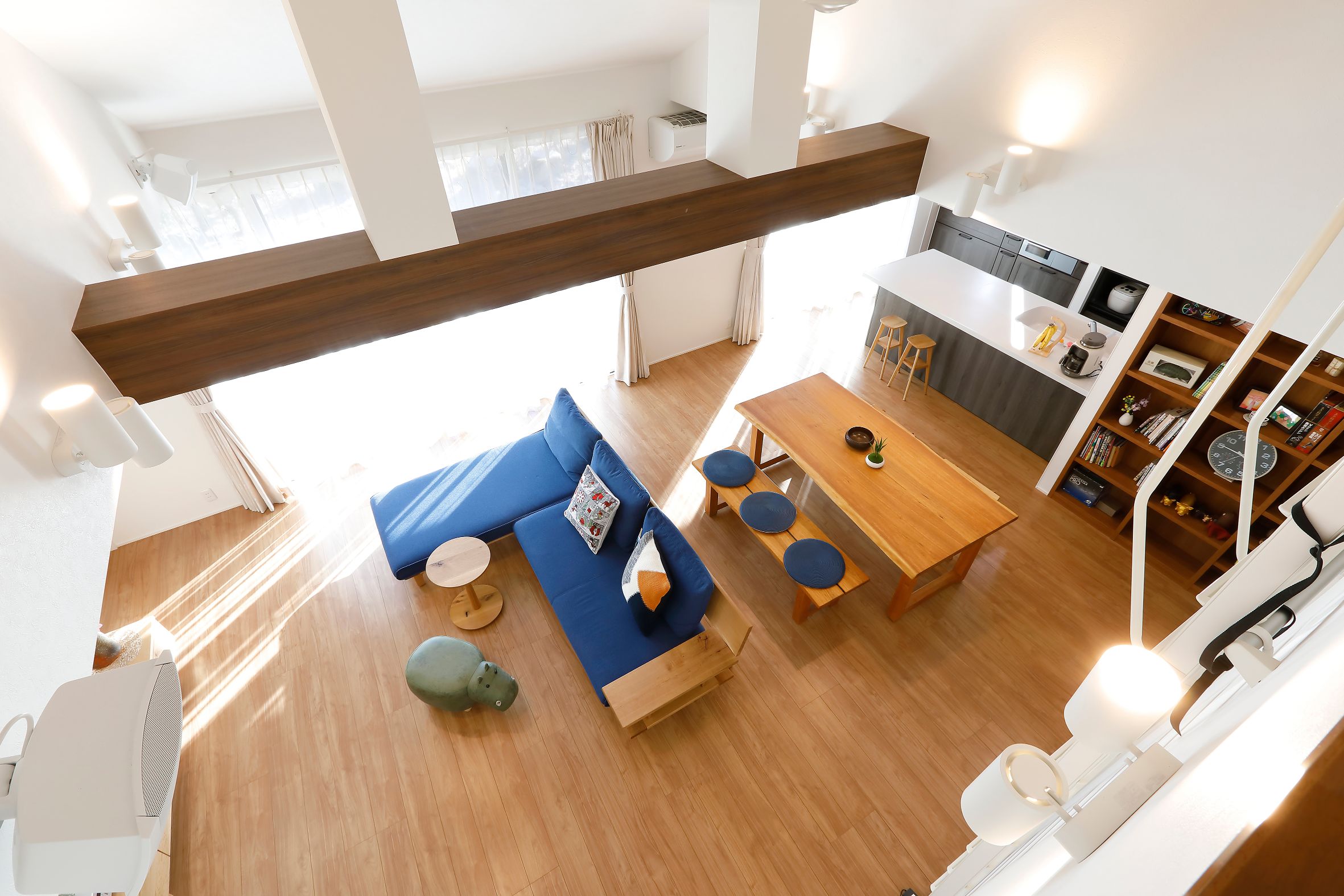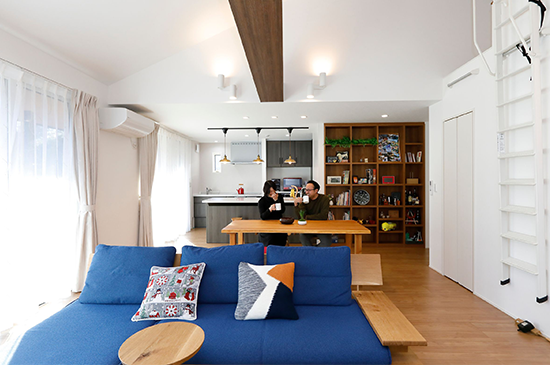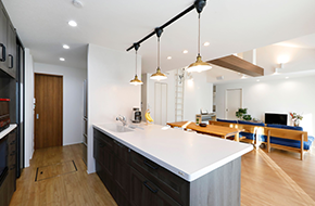 1階建|延床 約39坪|敷地 約245坪 「家事の働き方改革」でオンもオフも豊かに暮らす 動線に無駄がないから時短が叶う。家事がスムーズだから趣味を楽しむゆとりが生まれる。家全体がゆるやかにつながっているから家族の気配が感じられて子育てするにも安心。床をフラットにしたり、階段や浴室に手すりをつけるだけではない、これが新しい世代のバリアフリー。バリアフリーの平屋の家は、ご夫妻の暮らし方にぴったりでした。 1. カフェ風の吹抜けLDK 2. ダブルシンクのキッチン 3. 時短につながる快適動線 家族構成/ご主人、奥様 竣工年月/2019年9月26日 建物/シンセ ピアーナ 敷地面積/810.14㎡(245.06坪) 延床面積/132.16㎡(39.97坪) 効率的に暮らしを楽しむ工夫 ゴルフやバイク、釣りなど共通の趣味のほか、ご主人は映画・音楽鑑賞に楽器の演奏、奥さまはDIYと多趣味なご夫妻。家事を楽にこなせる動線をバリアフリーと捉え選択した平屋のマイホームには、仕事と趣味を両立しながら満喫するために、効率的に暮らしを楽しむ工夫が散りばめられています。それぞれの書斎は、プライベートルームであっても、扉ひとつでリビングとつながっているので、どこにいても家族がつながることができます。 壁と天井の白に映える梁や本棚 本棚やカウンターを作り付け、カフェやバーのような雰囲気をイメージしているのが26帖超えのLDK。リビング部分に設けた吹き抜けによる天井の高低差が大空間にリズムを作り、開放感が心地のいいご夫妻お気に入りの場所です。洗面室と接するキッチンには、一緒に料理をすることも多いご夫妻のためにシンクを2つ設置。役割分担し、思い思いに作業ができるので調理もはかどります。 布団派のご夫妻は寝室に畳を選択。畳スペースの小上がりには引き出し式の収納を利用して腰かけることもできます。 広い調理台は、カウンターにも。夜にはペンダントライトが、バーのような雰囲気を作り出します。 景色を眺めながら入浴できるよう、浴室の窓の外に坪庭を造る予定。 キーワード 吹抜け 家事ラク動線 自然や庭を楽しむ 面積 35〜40坪まで